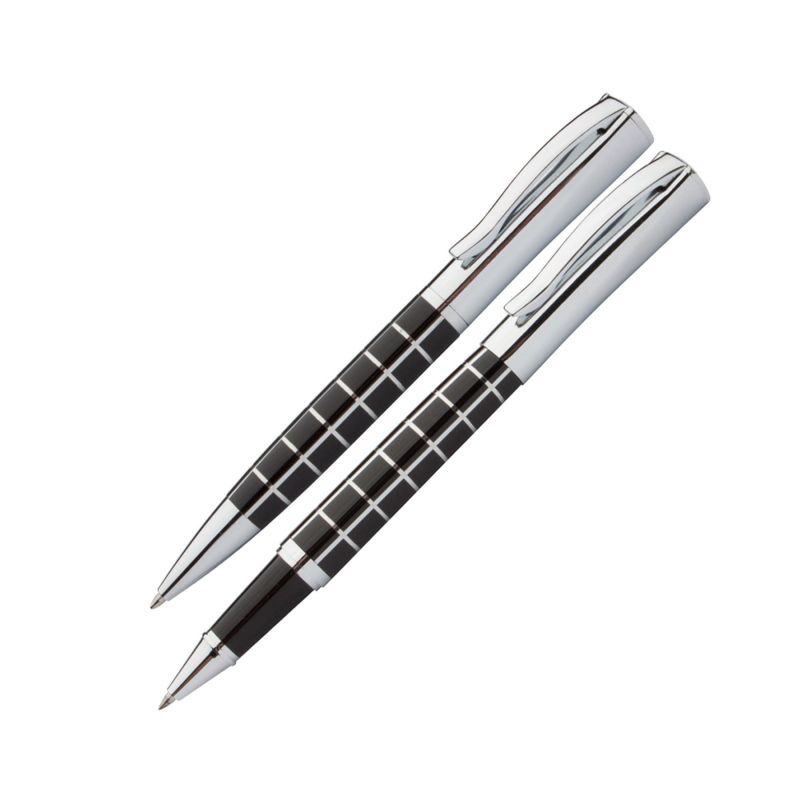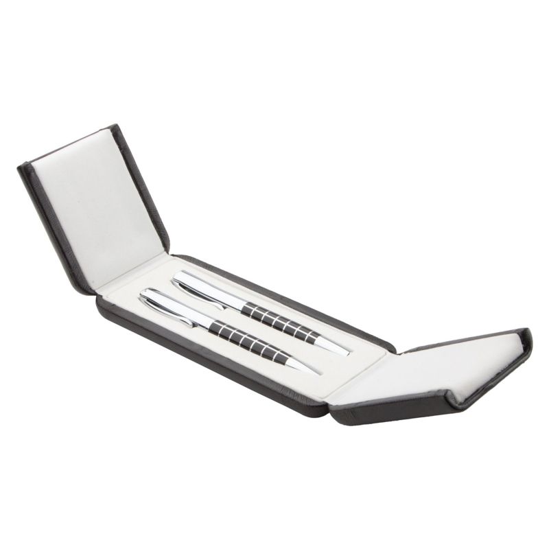 Химикалката и писалката са метални с блестящи хромирани детайли и елегантно се допълват с кожената подаръчна кутия.
