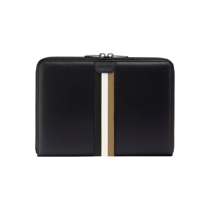 Тази A5 папка от BOSS съчетава динамично, спортно вдъхновено излъчване с луксозен и изчистен дизайн. Изработена от гладък, мек черен PU материал, тя е акцентирана с емблематичната трицветна лента в центъра и релефен BOSS етикет, който подчертава премиум характера на модела. Завършена е с метални ципове в gunmetal покритие, гравирани с логото BOSS — детайл, който носи още повече изисканост. Идеална за почитателите на марката, тази папка предлага стил, практичност и комфорт в ежедневната организация.