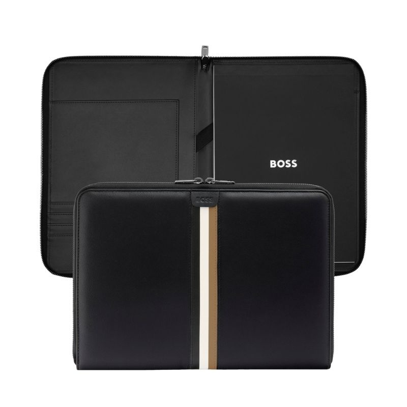 Тази A4 папка от BOSS съчетава активното, динамично излъчване със завършена, луксозна естетика. Изработена от гладък и мек черен PU материал, тя е акцентирана с емблематичната трицветна лента, отпечатана централно върху дизайна. В горната част лентата е допълнена от релефен BOSS етикет, който придава премиум характер, а циповете в gunmetal покритие с лого BOSS добавят още една нотка изисканост. Създадена за почитателите на марката, папката предлага стилен и удобен начин за организиране на документи.