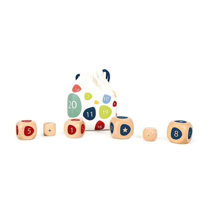 Тази чанта е пълна с математически задачи! Включени са шест зарчета, изработени от FSC® 100% сертифицирана дървесина, с които могат да се хвърлят безброй комбинации от математически задачи - от просто събиране и изваждане до по-сложни математически задачи (например умножение).