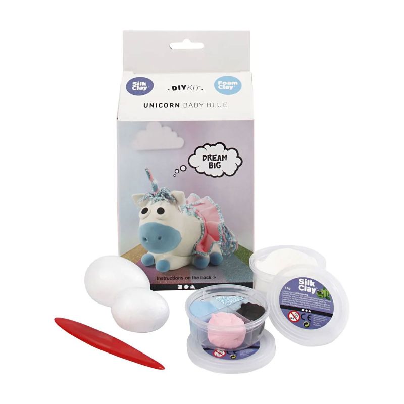 Този комплект включва всички материали, необходими за изработването на забавна фигурка на еднирог с помощта на Foam Clay® и Silk Clay®.