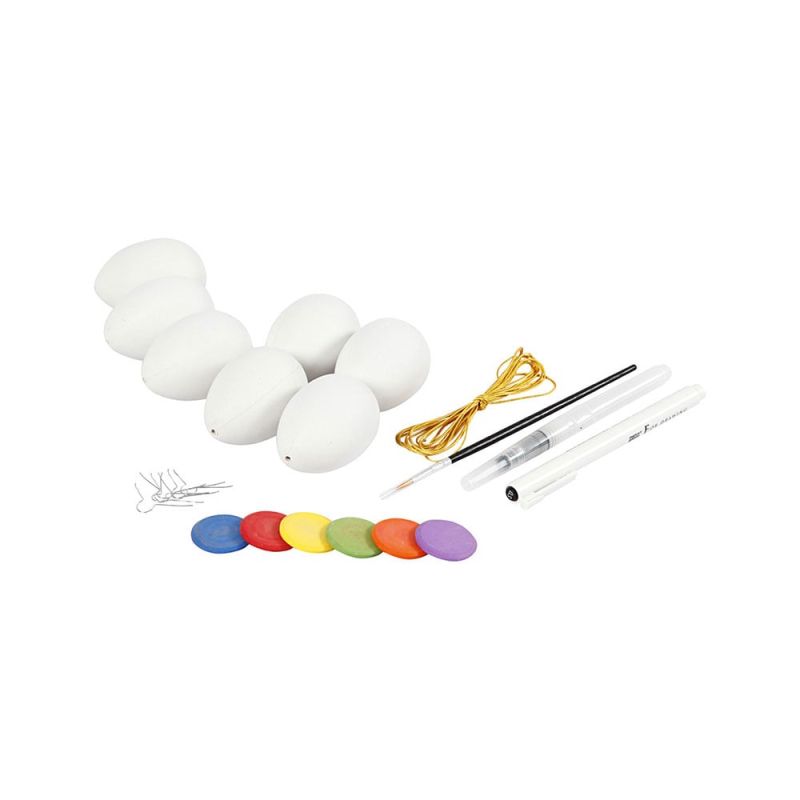 Съдържание: 7 пластмасови яйца, 6 различни цвята акварелни бои, 1 четка, кукички, 1 суспензия с водна четка и корда.