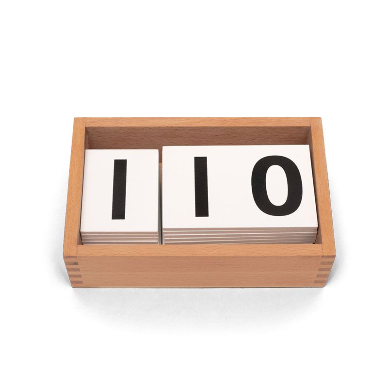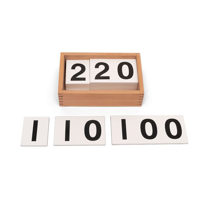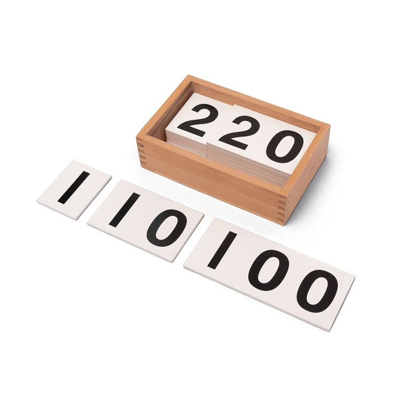 Набор от математически карти, които помагат за простото представяне на числата с помощта на цифри под формата на: единици (1-9), десетки (10), десетици- 90) и числото 100. Заниманието с дървени цифри развива и усъвършенства способността за създаване на трицифрени числа.