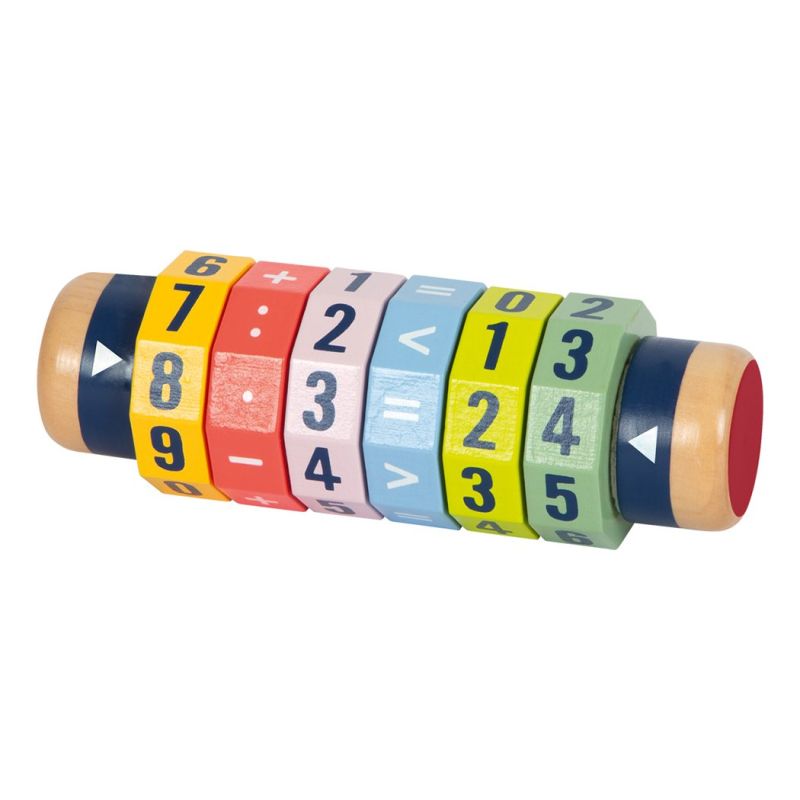 Дървеният търкалящ се калкулатор с шест въртящи се части позволява на младите математици да събират, изваждат, умножават и делят до числото 99.