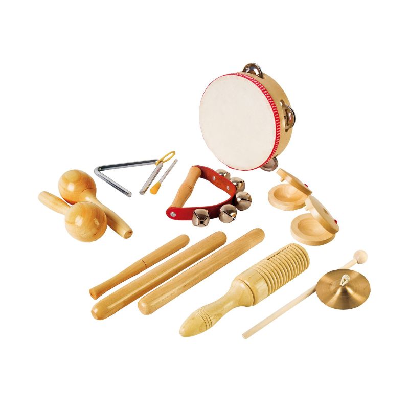 Комплектът съдържа 12 музикални инструмента: барабан със звънци (O 21 cm); 2 броя дървени маракаси (L 15.2 cm); триъгълник (D 10 cm); дървена дръжка с 5 камбани (10.5 х 8.5 cm); 2 броя кастанети (D 5.8 cm); чинела (ø 6 cm) с дървена пръчка; гуиро (L 20.5 cm).
