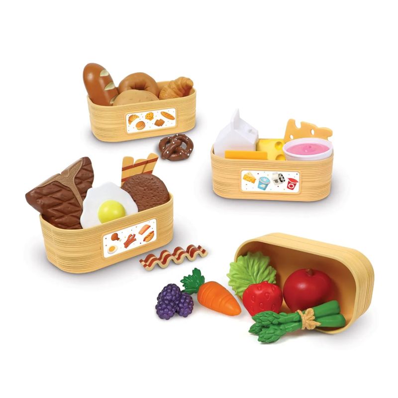 Комплектът включва: 4 кошници, 5 протеина, 6 плода и зеленчука, 5 зърнени храни и 5 млечни храни.