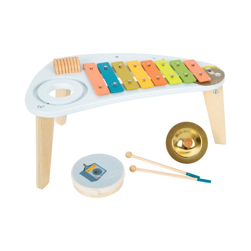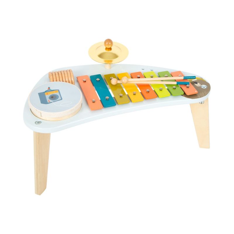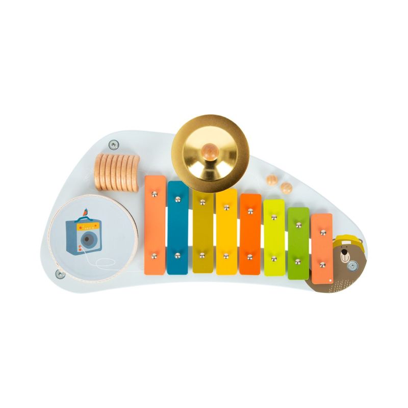 Тази здрава музикална маса стои на три крака и насърчава децата да събират разнообразни преживявания със звук, благодарение на чинелите, ксилофона, дрънкалката и подвижния барабан.