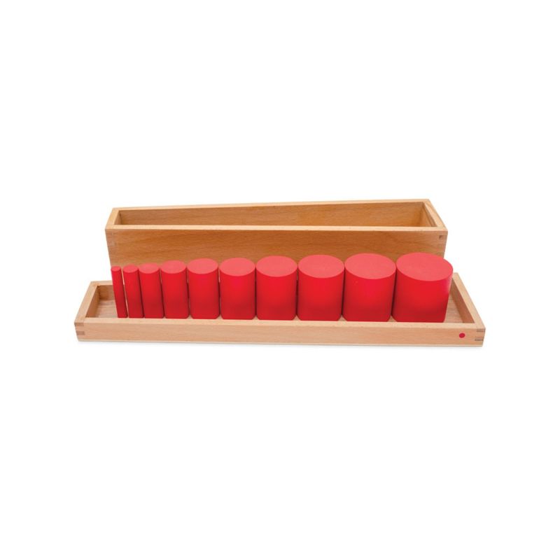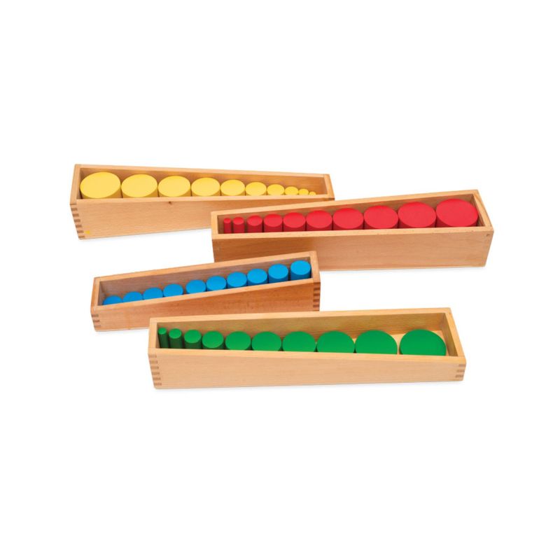 Размерът им (диаметър, височина) намалява или се увеличава. Първата кутия съдържа червени цилиндри - височината им е една и съща, но диаметърът на основите им намалява.