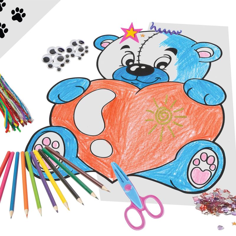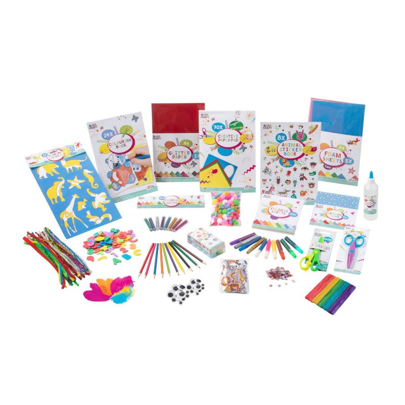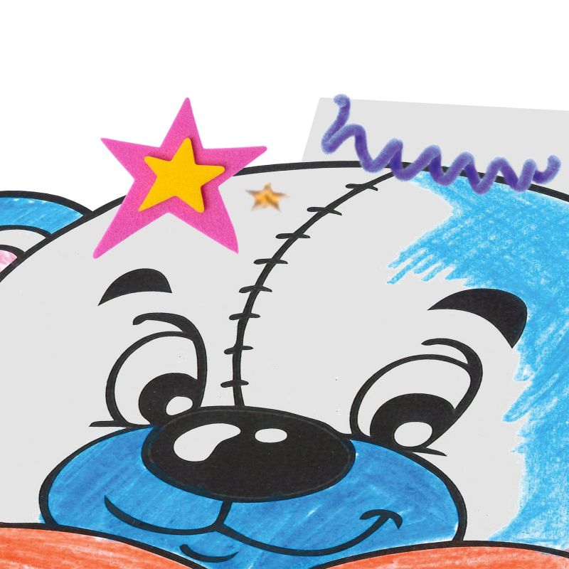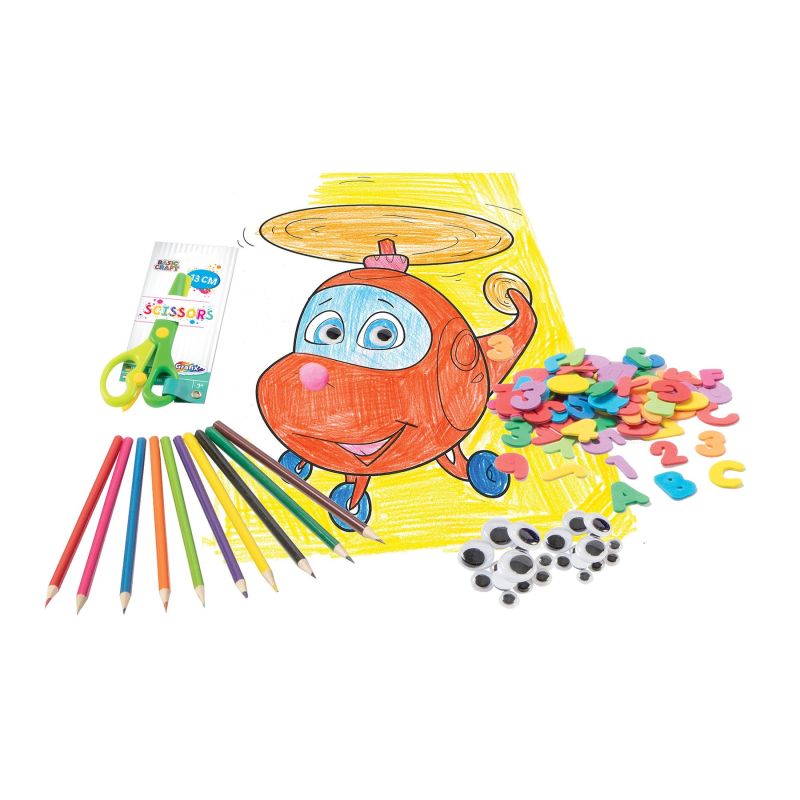 Комплектът съдържа 24 различни декорации: различни видове цветна хартия, стикери, книжка за оцветяване, текстилни декорации, пластмасови декорации, лепящи мърдащи се очички, 2 ножици, обикновено и брокатено лепило и други.