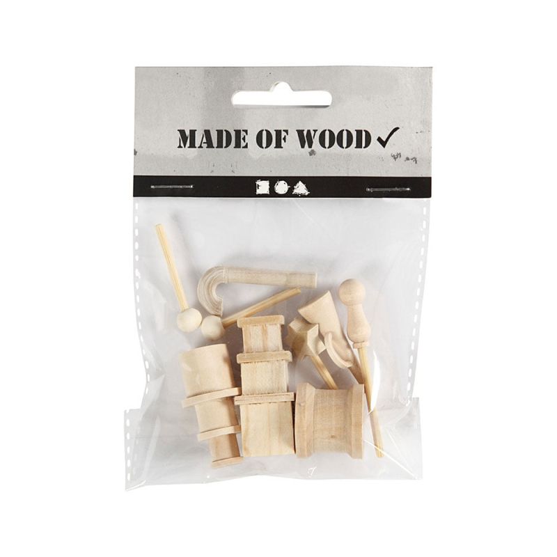 Комплектът съдържа малки коледни аксесоари за декорация, изработени от дърво.