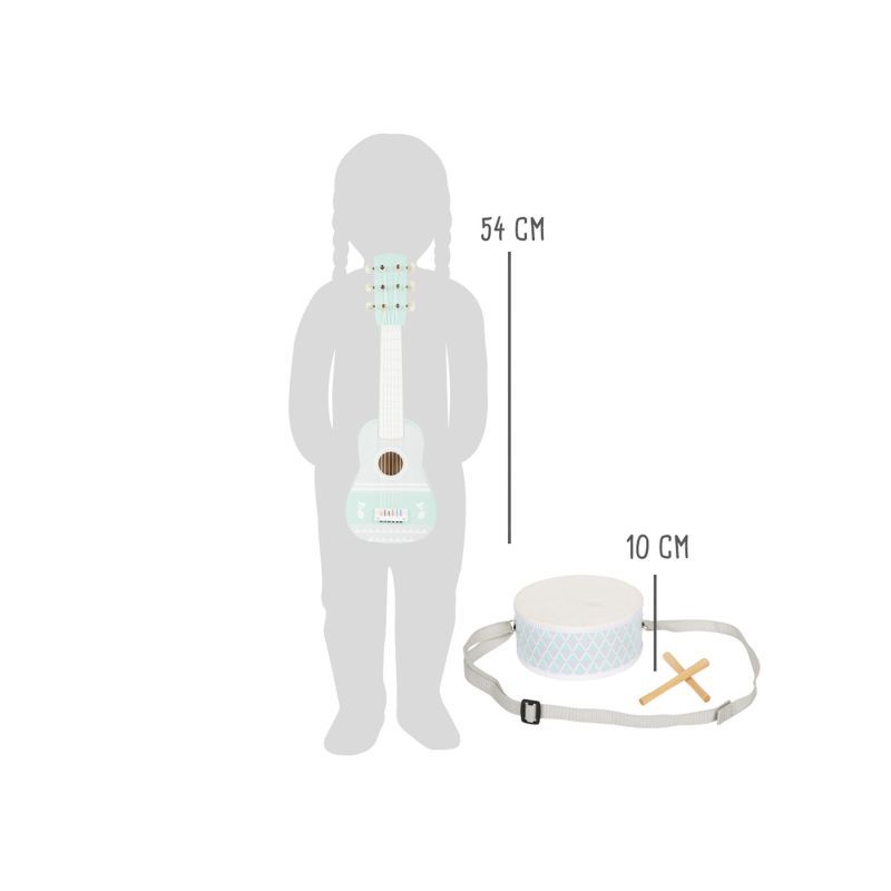 Комплектът от музикални инструменти, състоящ се от китара, ксилофон и барабан в нежни пастелни цветове, осигурява уникални музикални забавления. Трите атрактивно проектирани инструмента не само ще превърнат детската стая в концертна зала, но и ще бъдат атрактивен акцент! С тези музикални инструменти децата могат да се потопят в света на музиката и да се докоснат до първите си преживявания с ритъм и звук. Инструментите насърчават детското творчество.