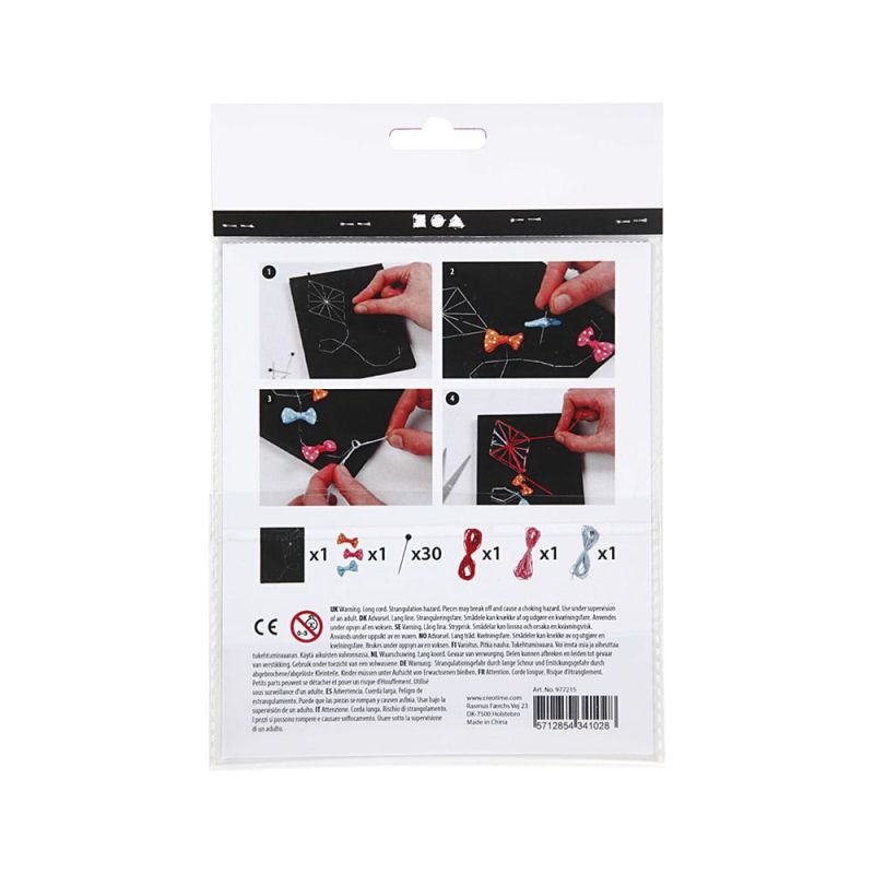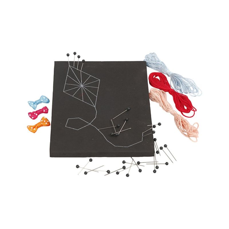 Съдържание: 1 плоча от твърда EVA пяна с предварително отпечатан мотив, пинчета, прежда за бродиране в 4 цвята и панделки.