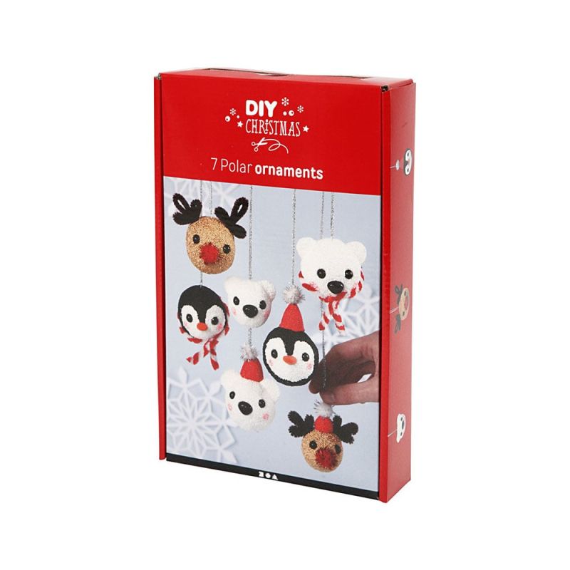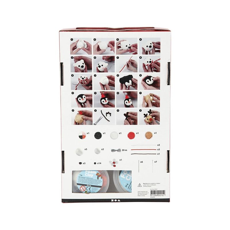 Съдържание: пяна и полимерна глина в няколко цвята, 7 броя, 6 броя плюшен шнур в 3 цвята, помпони с блясък, сребърни връвчици за окачване, очи и носове.