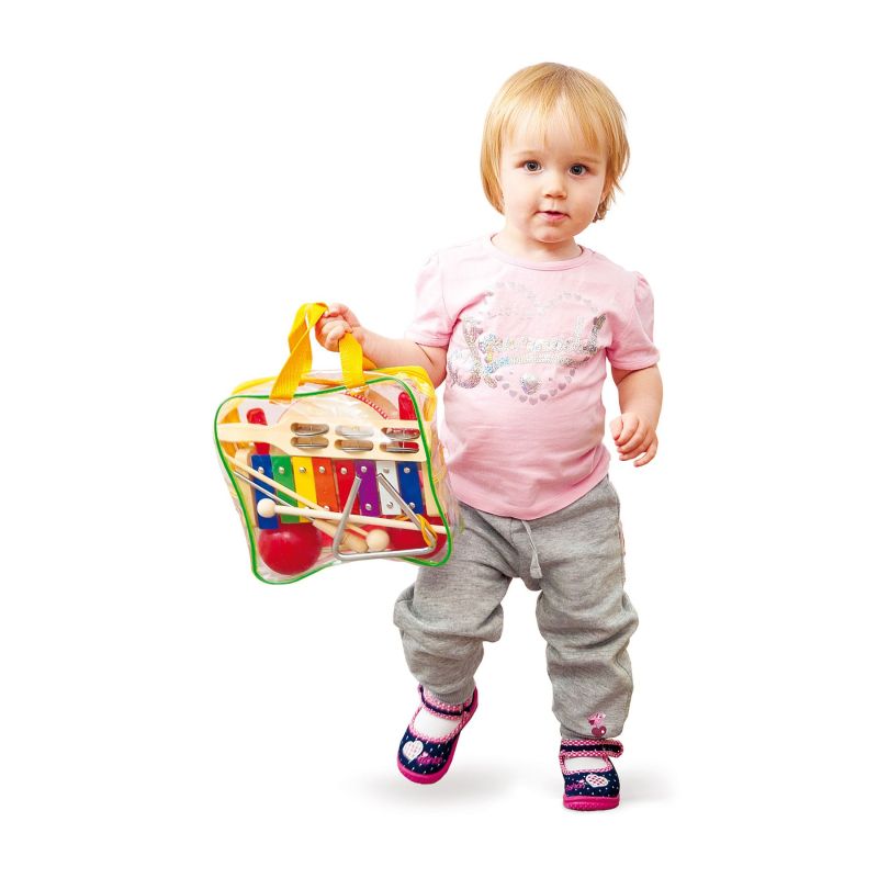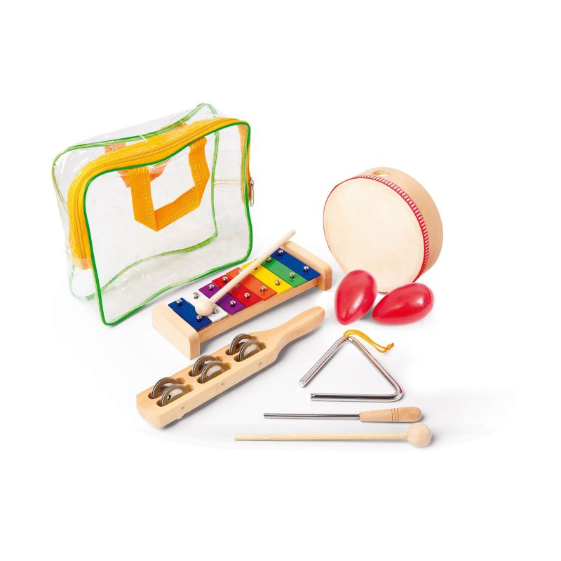 Съдържание: дървен барабан (D 15 cm), камбани (L 22 cm), пластмасови маракаси (H 18 cm), триъгълник (H 10 cm) с пръчка (L 16 cm), 2 дървени барабанни пръчки (L 20 cm), чинели с дървени дръжки (L 25 см).