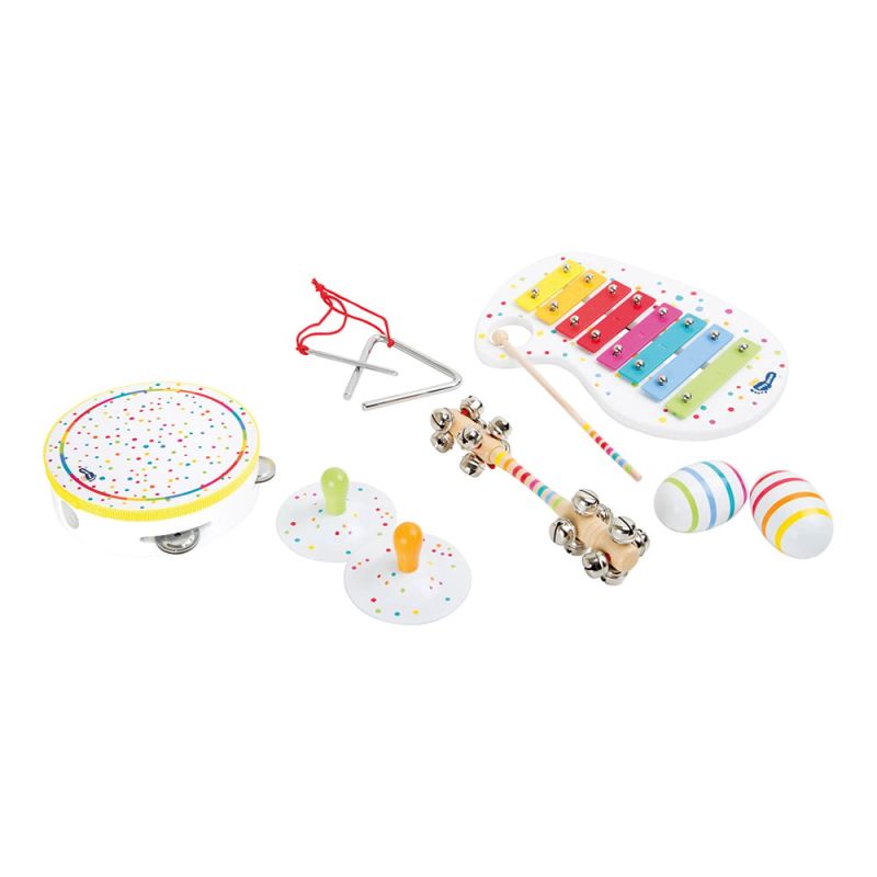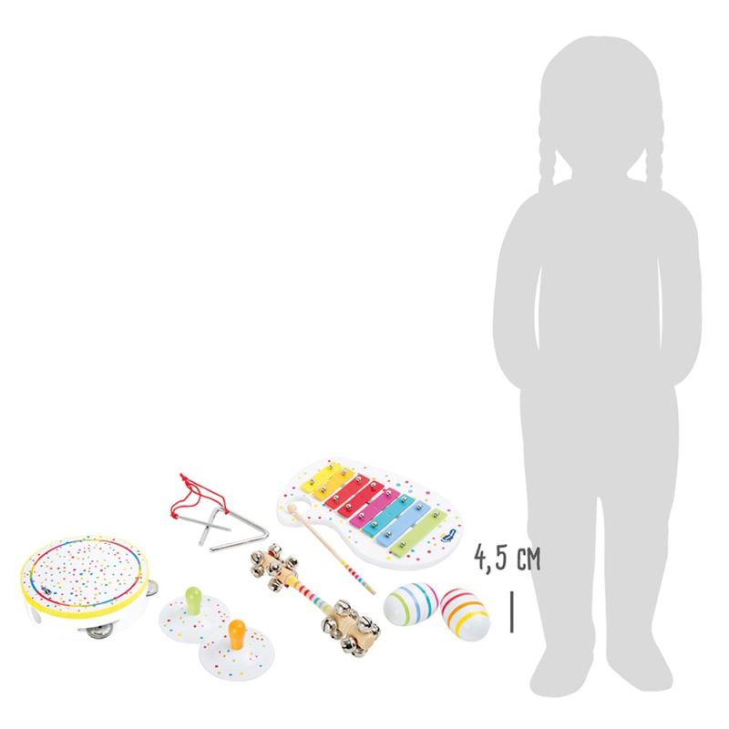 Комплектът от 10 музикални инструмента е идеален за вашето музикалното изпълнение! Разполагате с шест различни инструмента с индивидуални звуци. С дрънкалка, камбани, ксилофон, тамбурина и триъгълник всеки член на групата ще намери своя подходящ инструмент.