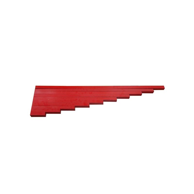 Съдържание: 10 червени кубчета с различна дължина, като дължината се увеличават съответно с 10 cm (от 10 cm до 1 m).
