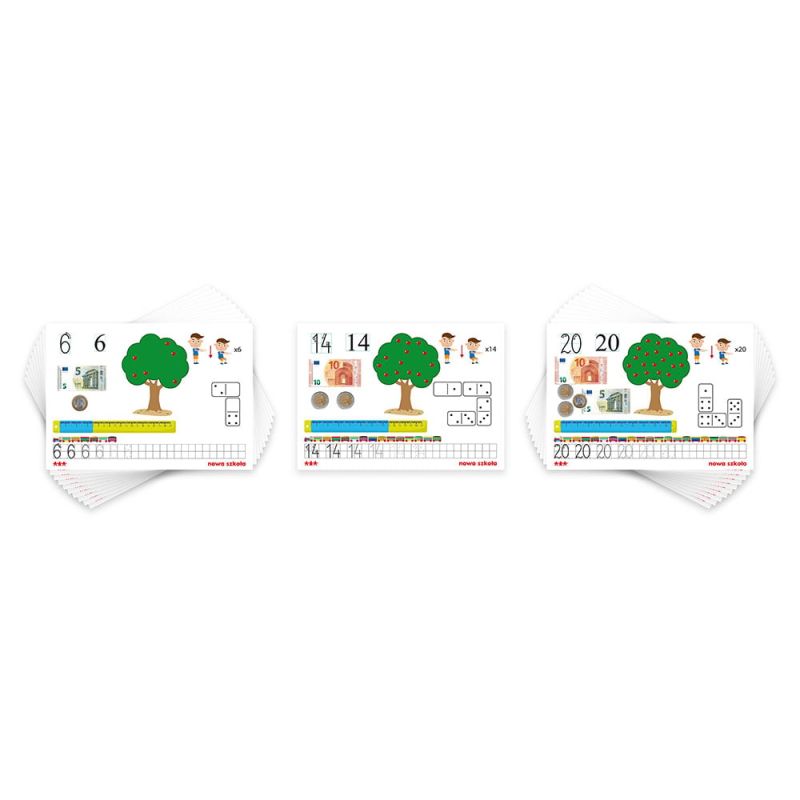 Комплектът напълно отговаря на тази цел. Съдържа 21 дъски с числа от 0 до 20 и изчерпателно въведение към числата в необходимия кардинален, порядъчен и измервателен аспект.