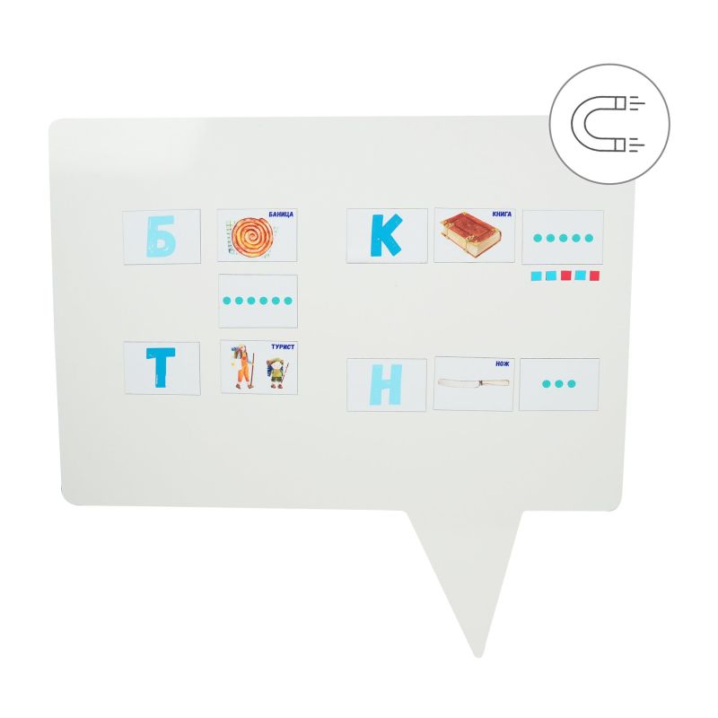 - групират думи по броя на гласните звуци.Комплектът съдържа 5 малки сини и 5 малки червени магнита и 64 пълноцветни магнити с букви, думи и звукови вериги.