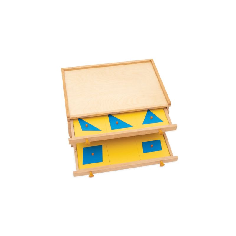 Дървен шкаф с 6 чекмеджета за съхранение на плоски геометрични фигури. Комплектът запознава децата със света на геометрията.