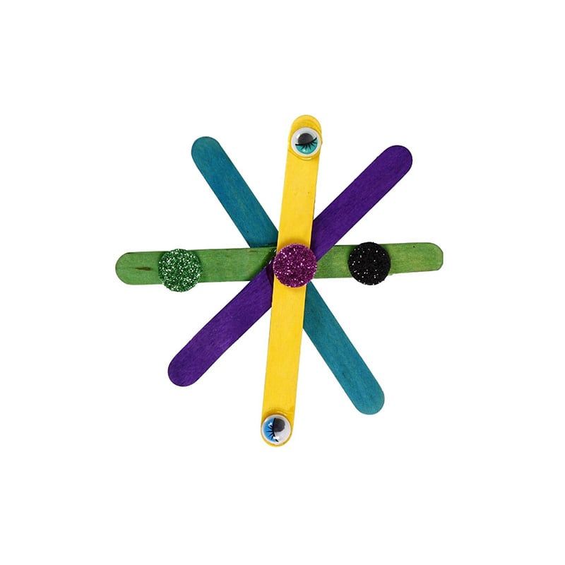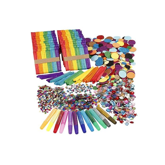 Комплект с материали за красиви и цветни орнаменти с дървени пръчки, мърдащи очички, мъниста и пайети – достатъчни за минимум 20 деца.Съдържание: 1000 броя цветни дървени пръчки, 60 броя мърдащи очички, 150 кръгчета от пяна, 4 x 10 g пайети, 800 броя мъниста и 12 цвята от брокатено лепило.