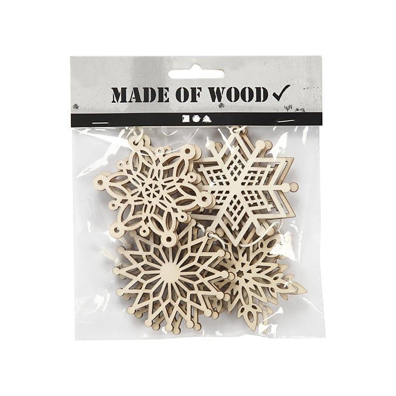 Коледни украшение, изработени от дърво с тъмни ръбове и връв за окачване.
