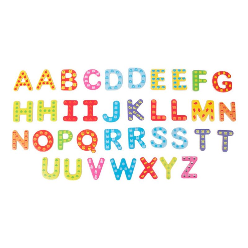 Комплектът се състои от 37 букви, изработени от цветно дърво с магнитно покритие.