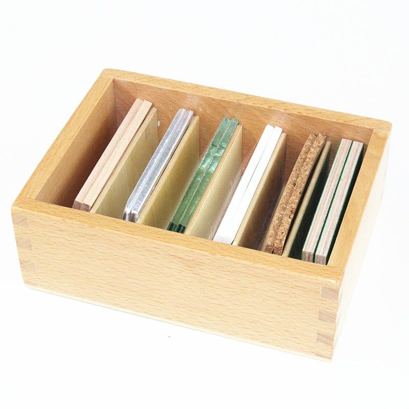 • Дървена кутия с 12 плочици, направени от различни материали, чрез които се развива усещането за температура у детето. Кутията е с отделения за всяка двойка плочки.