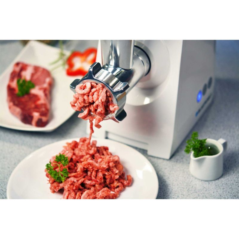 Комплектът включва 3 плочи от здрава иноксова стомана с отвори 3, 5 и 7 mm и нож, тласкач и пълнител за колбаси. Комфортът при работа се допълва от метална купа за мелене и тава за подаване, за да се осигури дълга и безпроблемна работа на уреда.