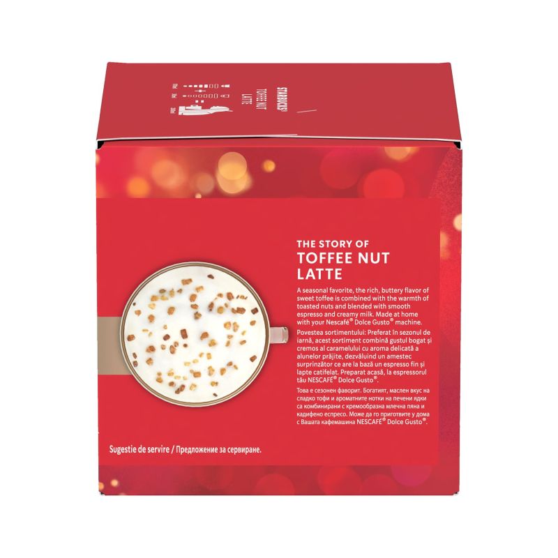 Продуктът STARBUCKS Toffee Nut Latte е част от коледното меню на Starbucks и вече е достъпен и за ползвателите на машини NESCAFE Dolce Gusto®. Богатият, маслен вкус на сладко тофи и ароматните нотки на печени ядки са комбинирани с кремообразна млечна пяна и кадифено еспресо.