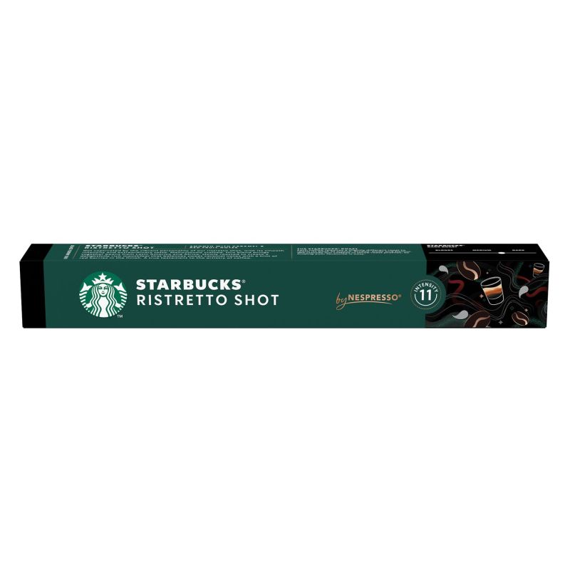 Наслади се на STARBUCKS® Ristretto Shot от Nespresso® – кутия с 10 броя кафе капсули, приготвени от същите кафе зърна 100% Арабика, използвани в кафетериите STARBUCKS®. Наслади се на този бленд бавно изпечени кафе зърна, допринасящи за богато вкусово усещане. Остави се да бъдеш възхитен от балансираните сладки карамелени нотки с послевкус от нотки на червени плодове, които предлагат незабравимо кафе изживяване.