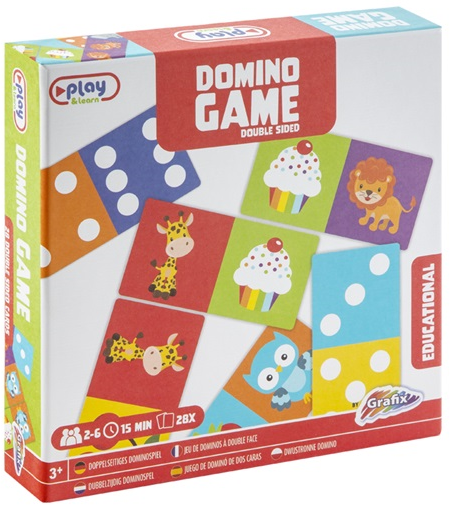 Двустранно домино - 28 карти с домино от едната страна и животни от другата, подходящо за от 2 до 6 играча.