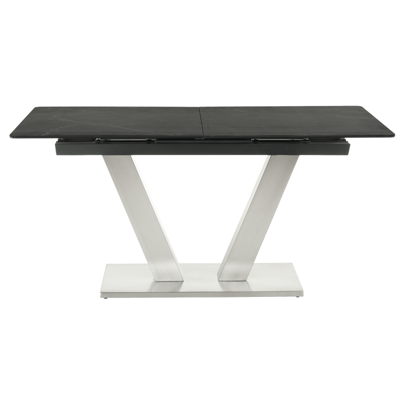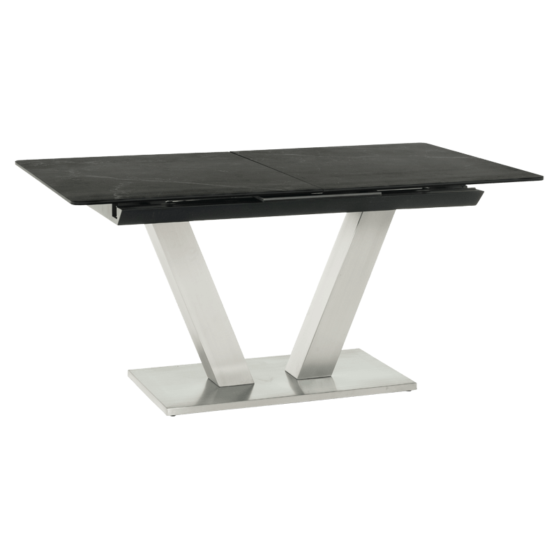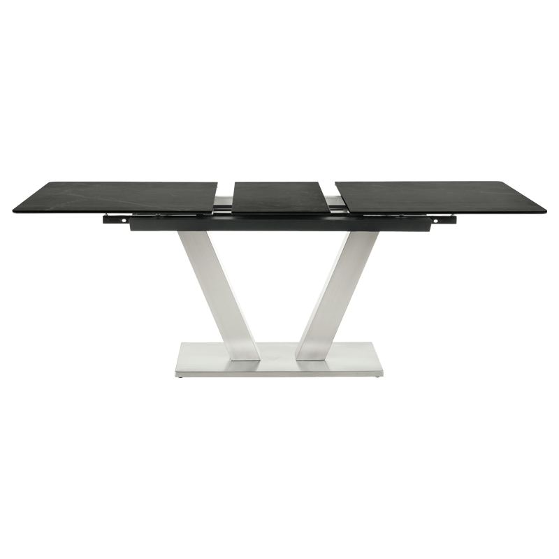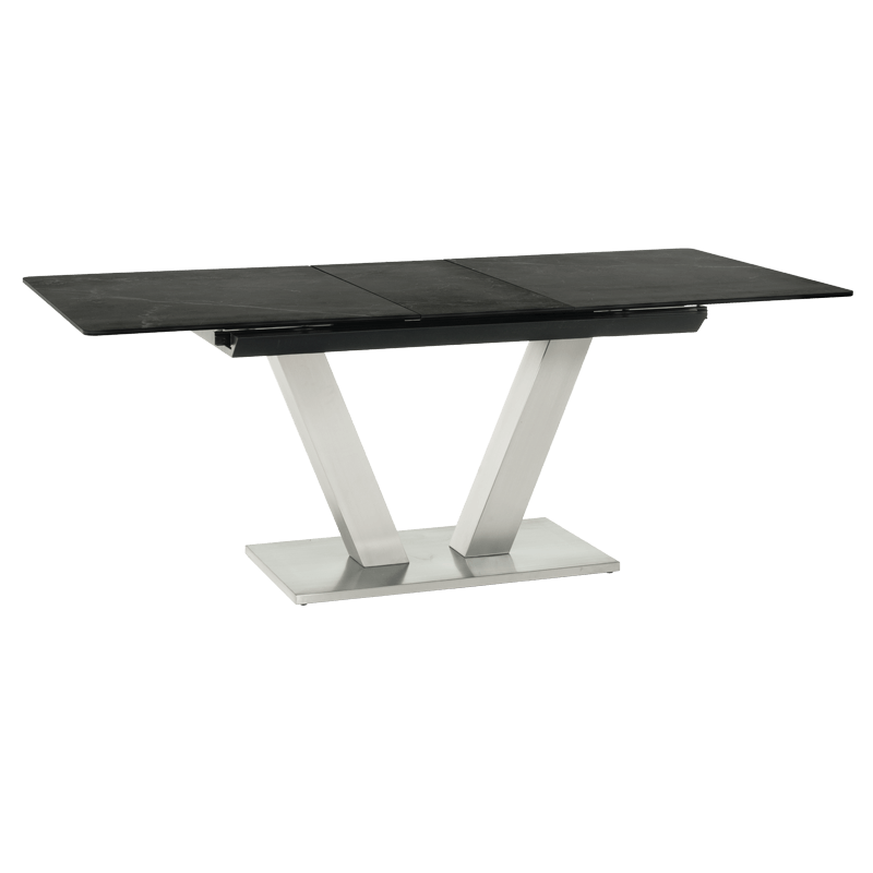 Разтегателната трапезна маса DUKLA впечатлява с модерен дизайн и висококачествена изработка. Плотът е от керамика и закалено стъкло, а основата от неръждаема стомана с изящен блясък, който създава усещане за лукс. Пълна информация за размерите и характеристиките на модела ще намерите в таблицата в таб/поле "Техническа информация".