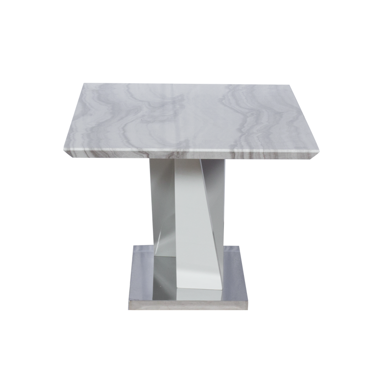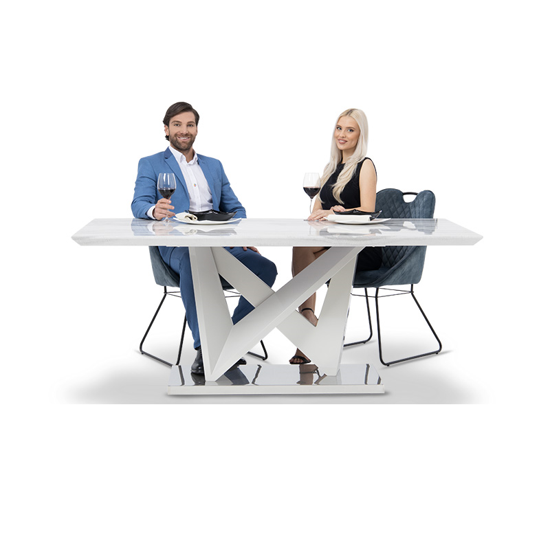 GEORGIA е масивна трапезна маса с оригинален и стилен дизайн. Моделът е с голям плот с размери 180 х 100 см., който е изработен от МДФ материал с покритие в мраморен цвят. Интересната основа с необичайна форма също е направена от МДФ, а в долната част от неръждаема стомана. Пълна информация за размерите и характеристиките на модела ще намерите в таблицата в таб/поле "Техническа информация".