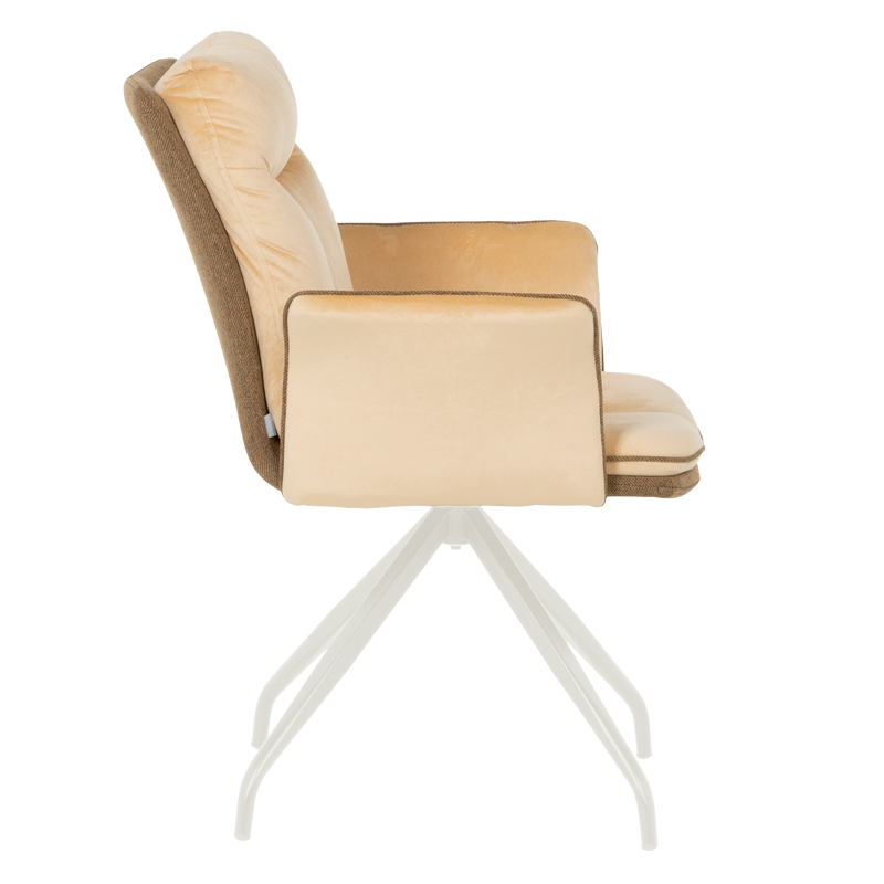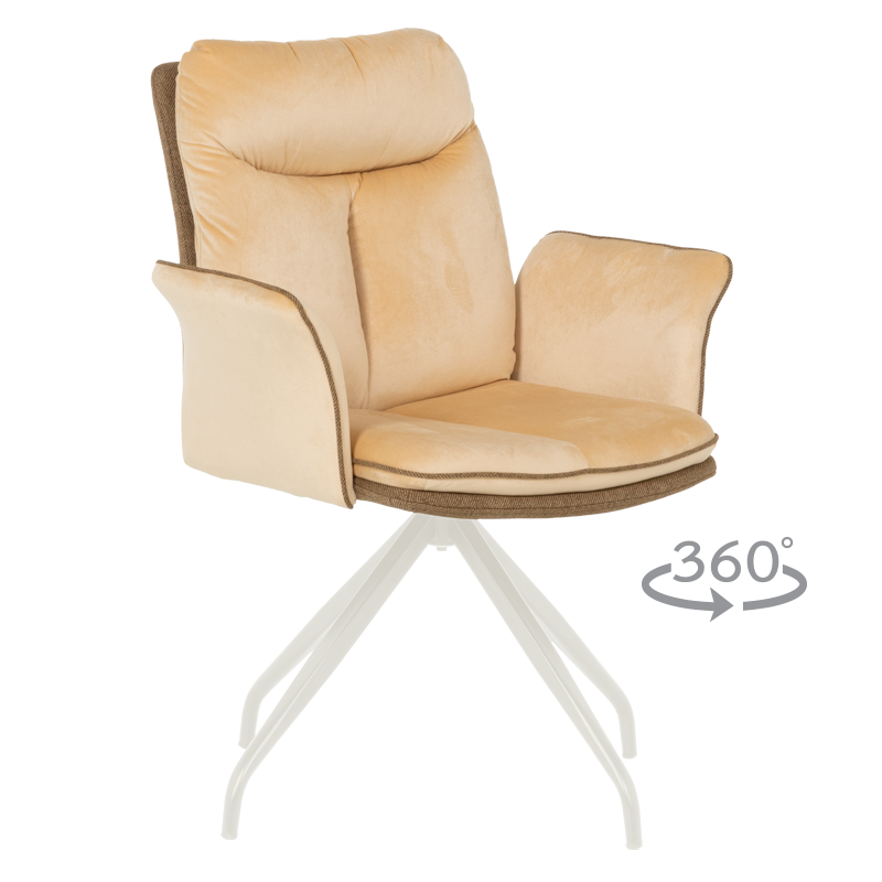 MARLOW 1 е трапезен стол с модерна визия. Той разполага с широки седалка и облегалка, тапицирани в мека дамаска, допълнени с възглавници за максимален комфорт. Подлакътниците повишават удобството на седящия. Основата е изработена от метал в елегантен кремав цвят и предлага иновативна функция за 360° въртене. Пълна информация за размерите и характеристиките на модела ще намерите в таблицата в таб/поле "Техническа информация".