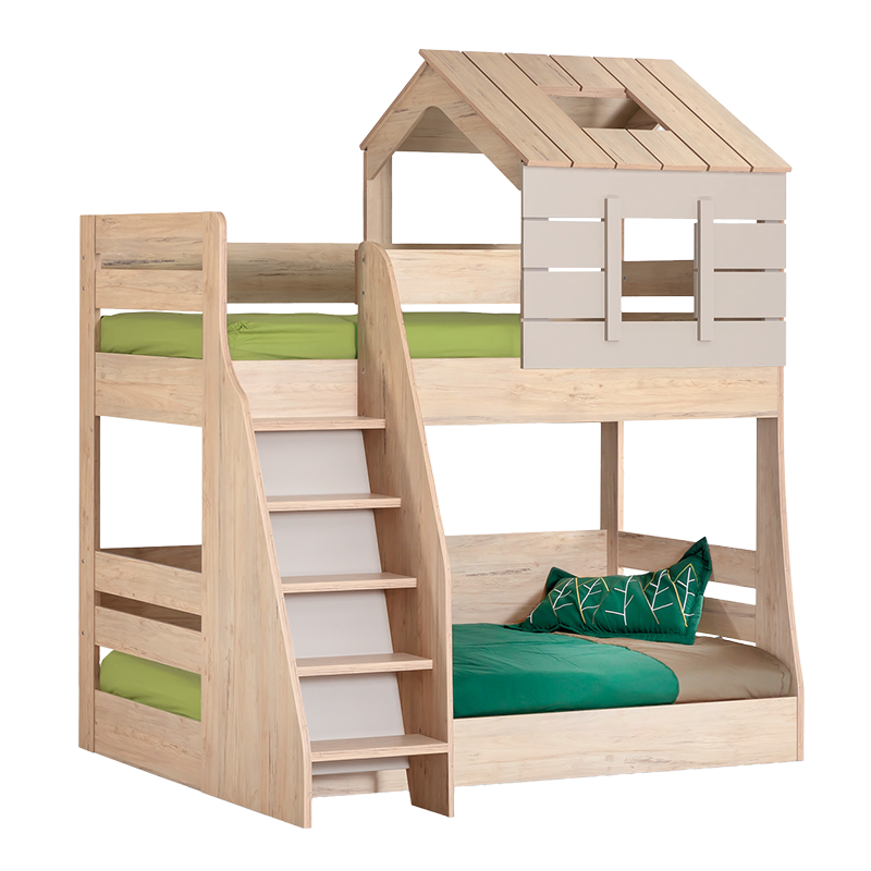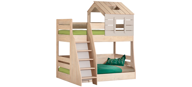 Двуетажно детско легло MY HOUSE развива въображението, носейки усещане на малчуганите за любима къщичка на дърво. Моделът позволява ефективно използване на пространството, като същевременно създава удобство на децата. Може да използвате долната част на двуетажното легло My House, което отговаря на философията Монтесори, както за кът за игра, така и за спане. Пълна информация за размерите и характеристиките на модела ще намерите в таблицата в таб/поле "Техническа информация".