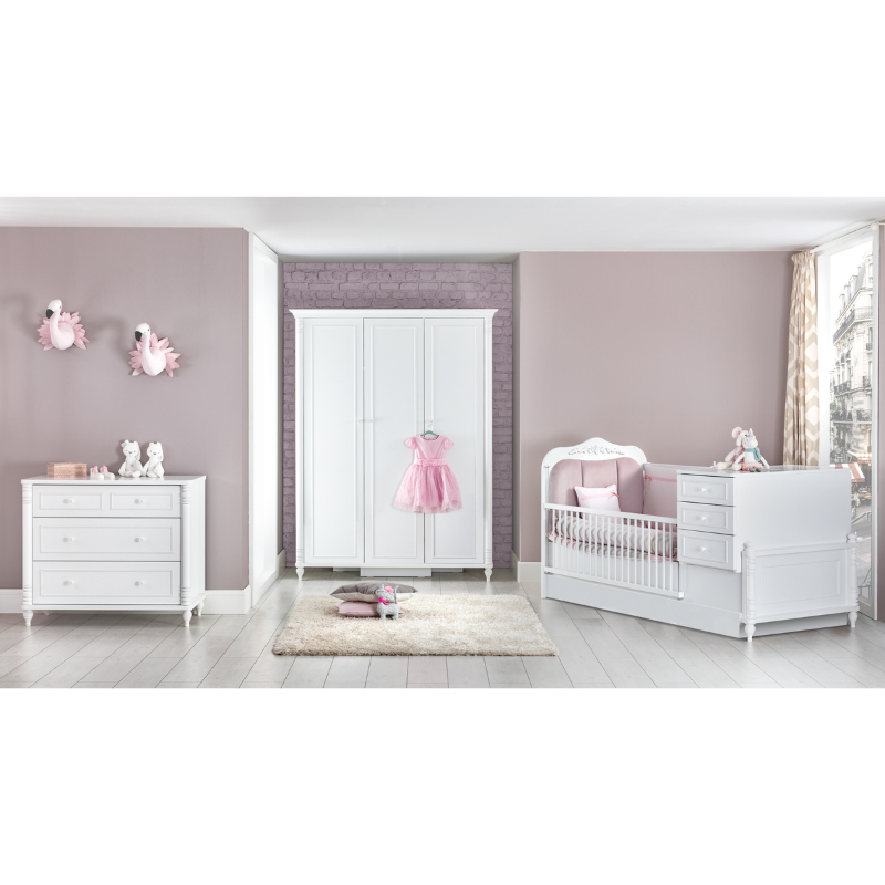 Изберете бебешка кошара от серия NIL, която расте заедно с вашето дете и се трансформира в удобно легло бързо и лесно. Единственото, което трябва да направите, е да свалите предпазната решетка. Моделът разполага с 3 допълнителни чекмеджета, в които може да съхранявате всички принадлежности на вашето малко съкровище. Стабилната бебешка кошара и легло 2в1 е с компактни размери и се вписва чудесно у дома - ширина 100 см, дължина 196 см, височина 107 см. Пълна информация за размерите и характеристиките на модела ще намерите в таблицата в таб/поле "Техническа информация".