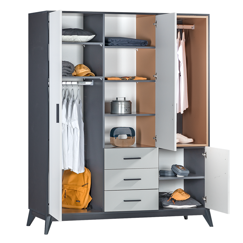Трикрилният гардероб BREDA съчетава модерен дизайн и функционалност, идеален за организиране на дрехи и аксесоари. Оборудван е с просторни отделения, включително рафтове и лост за закачалки, осигуряващи отлична подредба. Допълнителното LED осветление във вътрешността предоставя удобство и стил, докато механизмът за плавно затваряне на вратите гарантира тишина и комфорт при употреба. Гардеробът е изработен от висококачествени материали, които гарантират здравина и дълготрайност. Пълна информация за размерите и характеристиките на модела ще намерите в таблицата в таб/поле "Техническа информация".