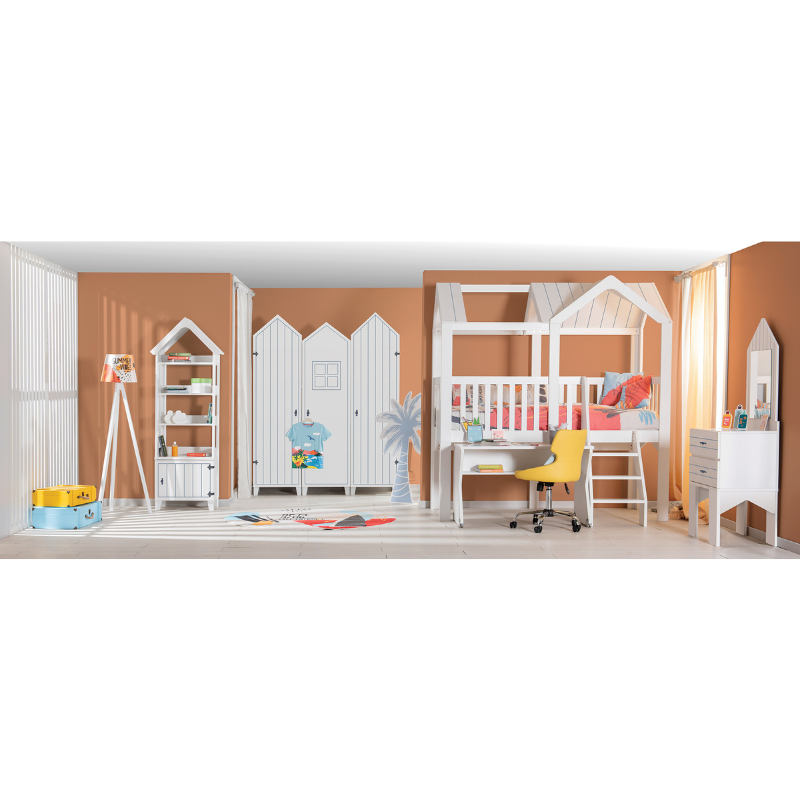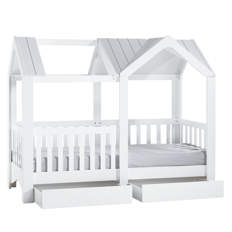 Детско легло MIAMI във формата на уютна къщичка съчетава модерен дизайн с принципите на метода Монтесори. Леглото е с включена подматрачна рамка и е проектирано на нивото на пода, което позволява на децата лесно да влизат и излизат сами от него - това насърчава независимостта и увереността им. Моделът е изработен от ПДЧ с дебелина 18 мм, гарантиращо стабилност и безопасност. За максимално удобство има възможност за добавяне на чекмеджета в долната част. Пълна информация за размерите и характеристиките на модела ще намерите в таблицата в таб/поле "Техническа информация".