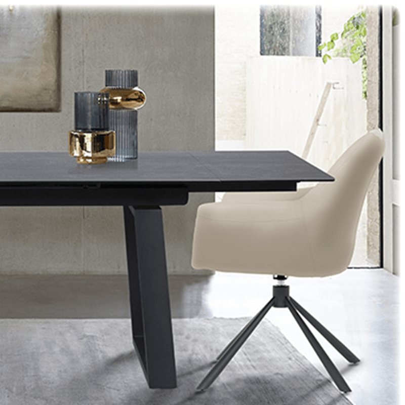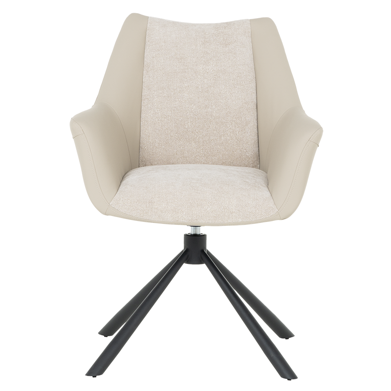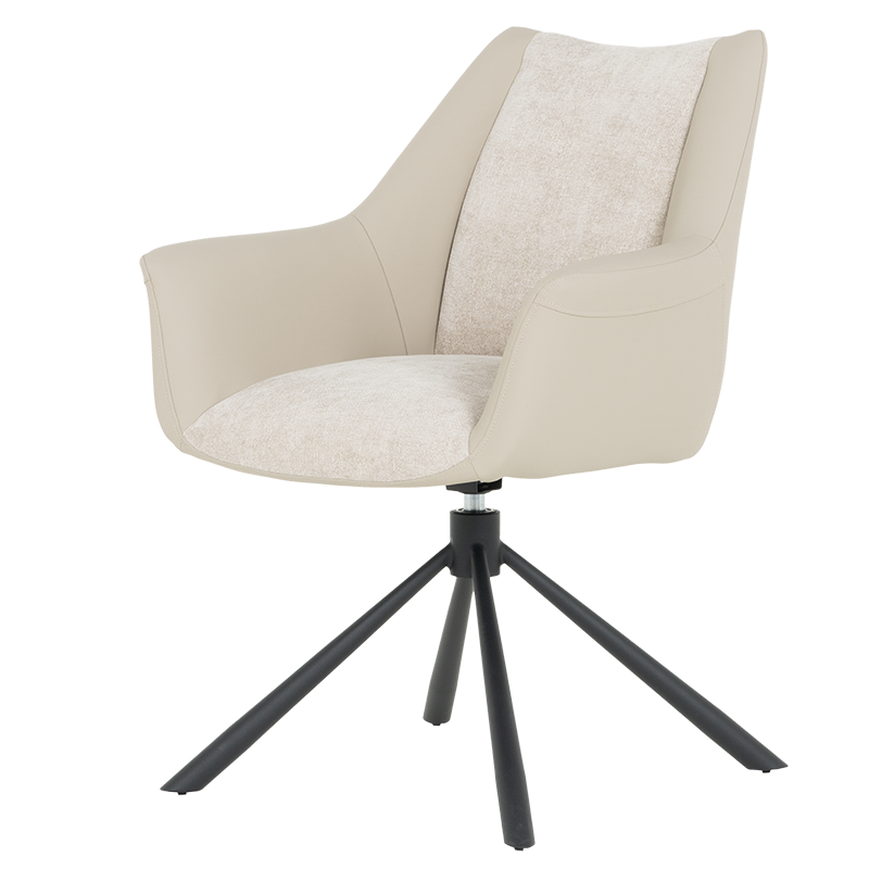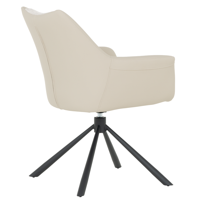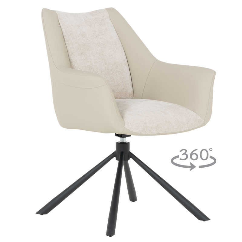 Трапезен стол TEMPE разполага с удобни подлакътници, широки седалка и облегалка, изработени от приятна на допир дамаска и висококачествена силиконова кожа. Интересната му основа е от метал, праховобоядисан в черно. Моделът има функция за въртене на седалката на 360° и връщането ѝ в изходяща позиция. Пълна информация за размерите и характеристиките на модела ще намерите в таблицата в таб/поле "Техническа информация".