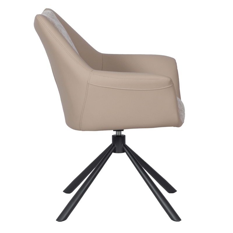 Трапезен стол TEMPE разполага с удобни подлакътници, широки седалка и облегалка, изработени от приятна на допир дамаска и висококачествена силиконова кожа. Интересната му основа е от метал, праховобоядисан в черно. Моделът има функция за въртене на седалката на 360° и връщането ѝ в изходяща позиция. Пълна информация за размерите и характеристиките на модела ще намерите в таблицата в таб/поле "Техническа информация".