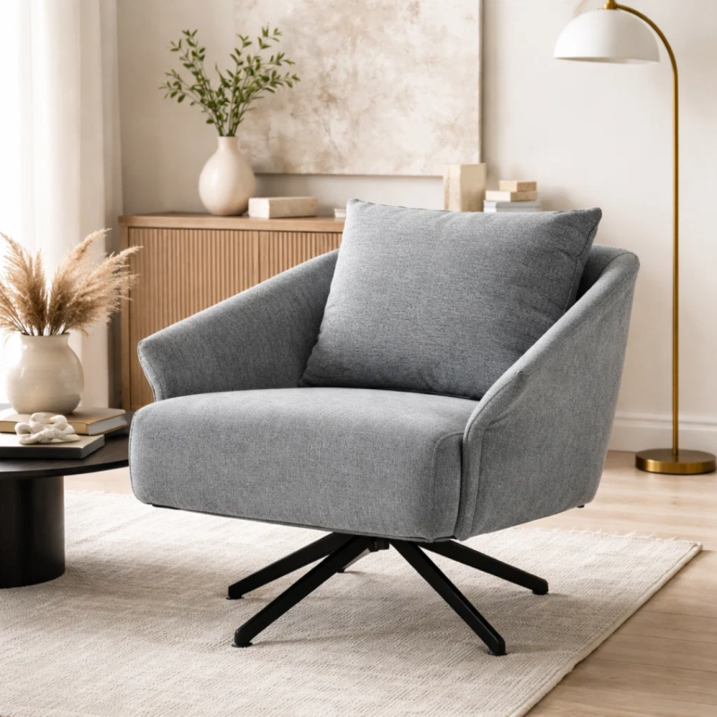 Кресло FERGUS е стилен и практичен избор за всеки модерен дом или изискан офис интериор. Седалката и облегалката са изработени от висококачествена дамаска, а краката от праховобоядисан метал. За по-голямо удобство моделът разполага с въртяща функция на 360°, както и с допълнителна възглавница. Пълна информация за размерите и характеристиките на модела ще намерите в таблицата в таб/поле "Техническа информация".