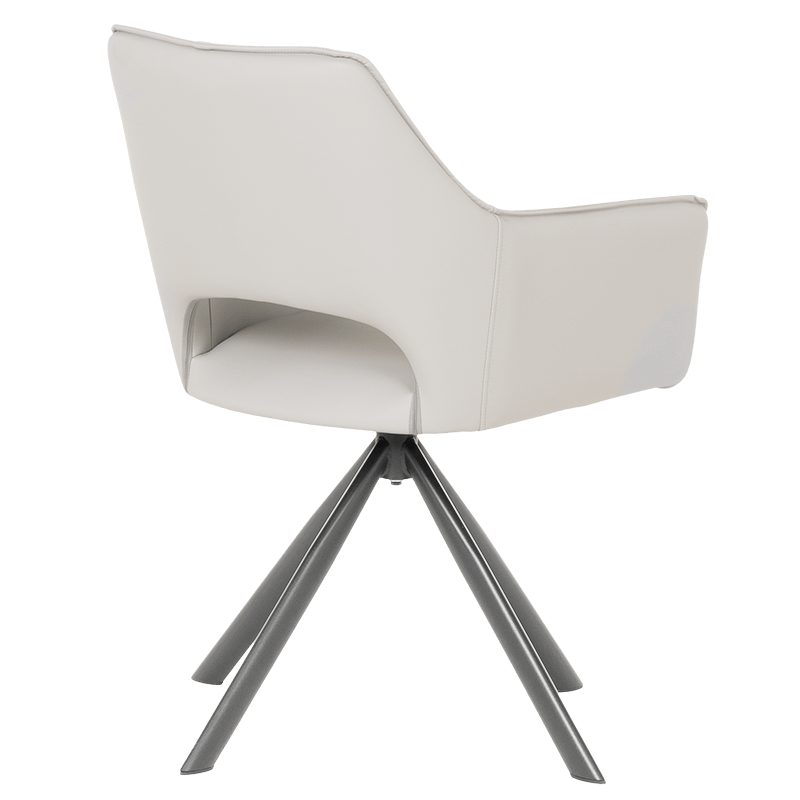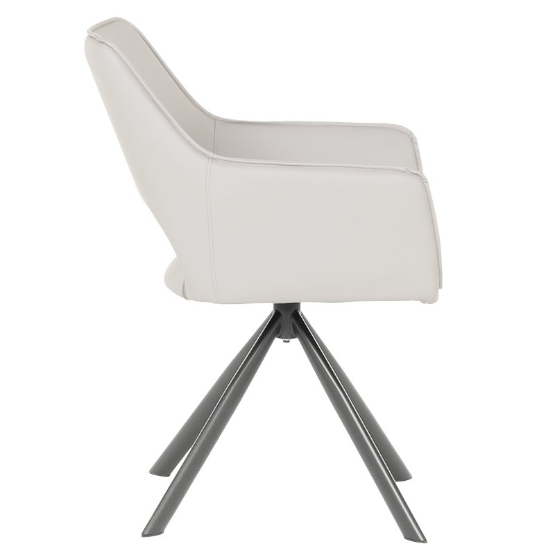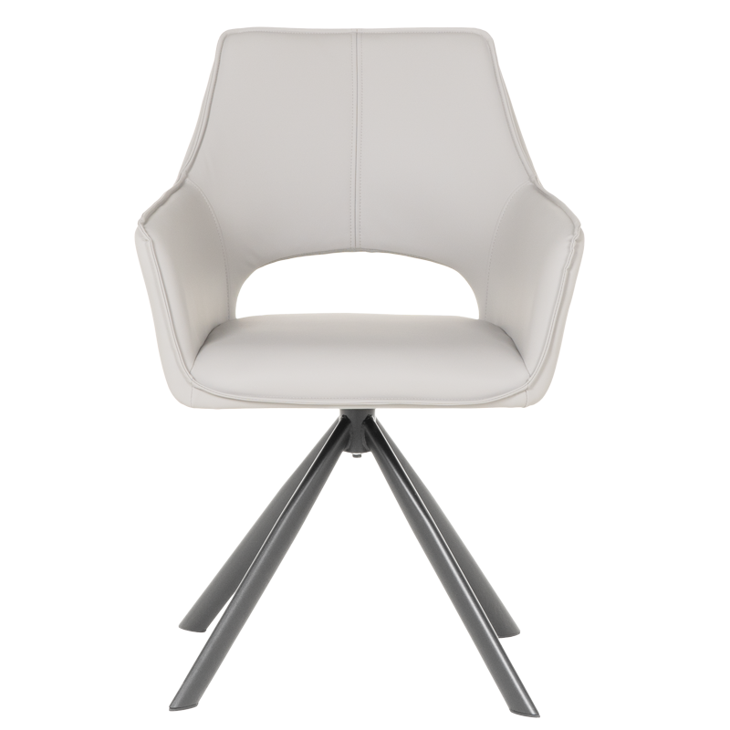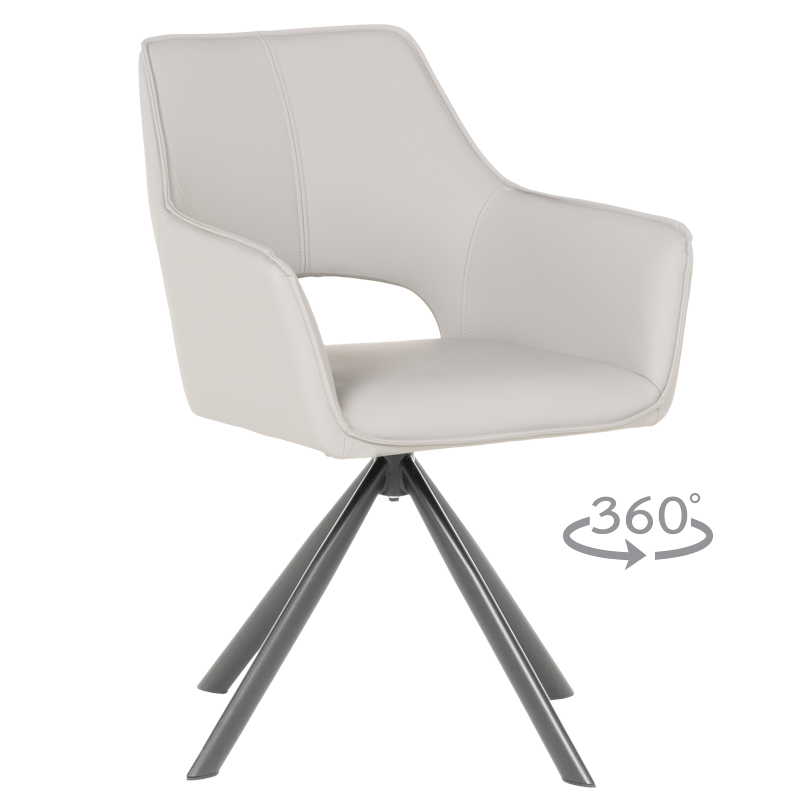 READING 2 е трапезен стол, който има широки облегалка и седалка, както и комфортни подлакътници от висококачествена силиконова кожа. Краката в интересна форма са изработени от праховобоядисан метал. Функцията за въртене на седалката на 360° носи допълнителен комфорт на седящия. Пълна информация за размерите и характеристиките на модела ще намерите в таблицата в таб/поле "Техническа информация".