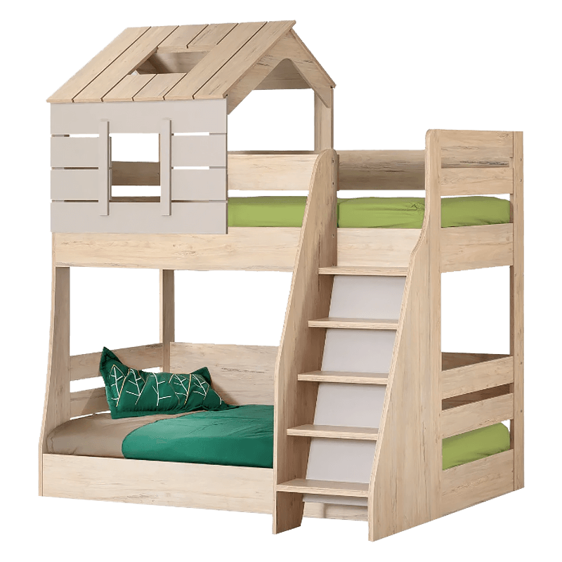 Двуетажно детско легло MY HOUSE е перфектно решение дори и за по-малки помещения. Страхотният дизайн на горска къщичка ще впечатли всеки малчуган. Моделът е изработен от висококачествени ПДЧ плоскости с включена подматрачна рамка. Горното легло е подходящо за матрак 90 х 200 см, а другото за матрак 100 х 200, като и двете предлагат практично решение за сън и почивка. Стълбичката, разположена от дясната страна, осигурява необходимата стабилност на децата при изкачване и слизане.
