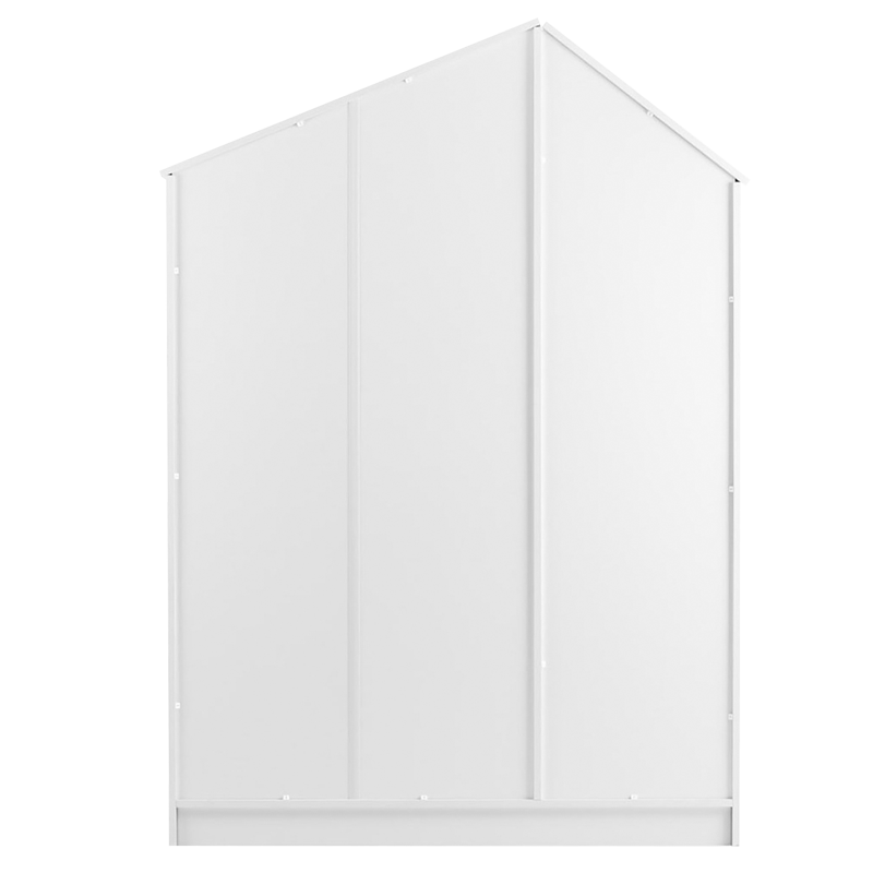 Трикрилен детски гардероб WHITE HOUSE има изчистен и стилен дизайн и се вписва чудесно във всеки интериор със своите сиви и бели цветове. Той разполага с голямо пространство, където да се съхраняват дрехи, играчки и други предмети. Благодарение на скосената част, наподобяваща покрив, създава забавна и приказна атмосфера в стаята на детето. Моделът е изработен от ПДЧ с дебелина 18 мм. Всеки един от неговите рафтове издържа на натоварване до 25 кг. Вратите на трикрикрилния гардероб се прибират плавно и безопасно с помощта на механизъм за плавно затваряне. Пълна информация за размерите и характеристиките на модела ще намерите в таблицата в таб/поле "Техническа информация".