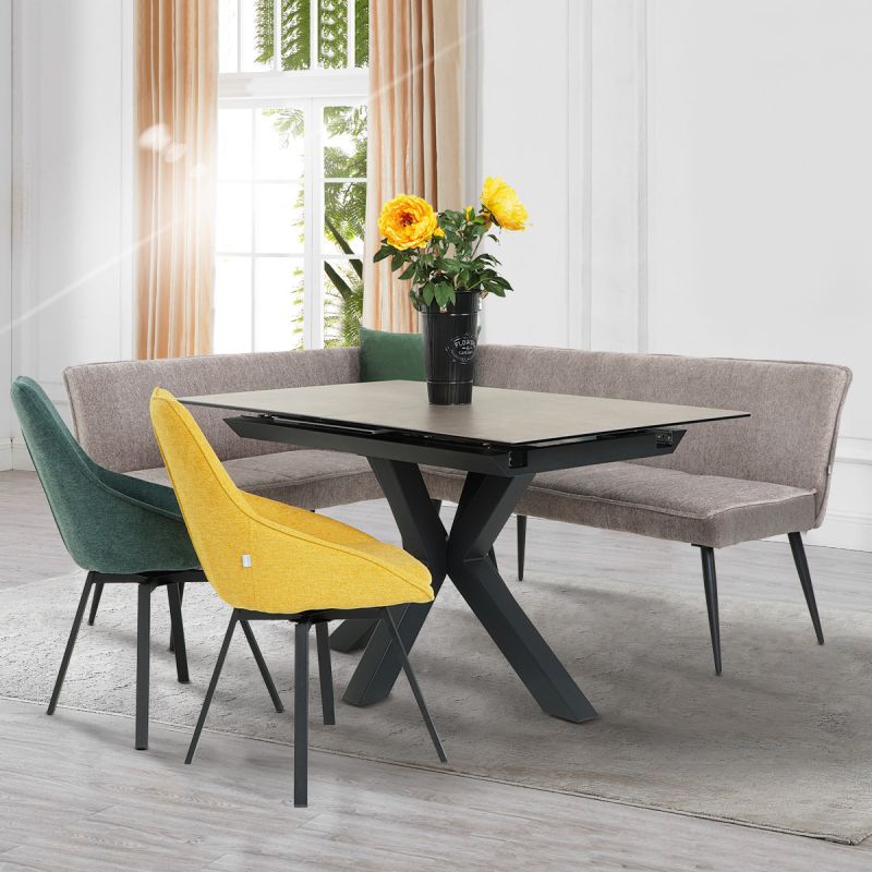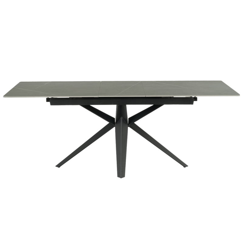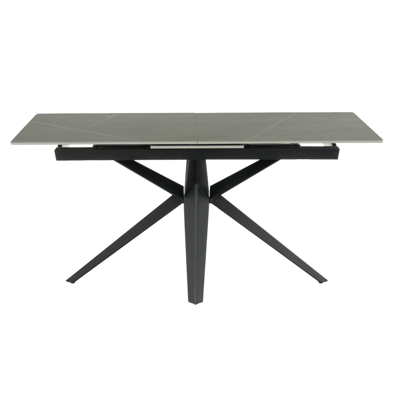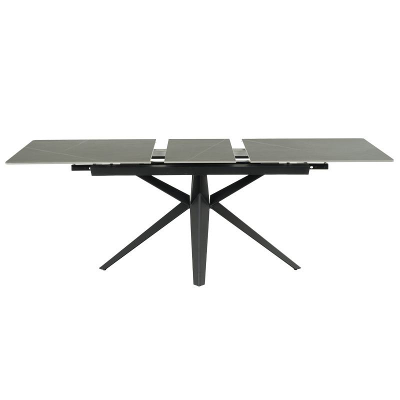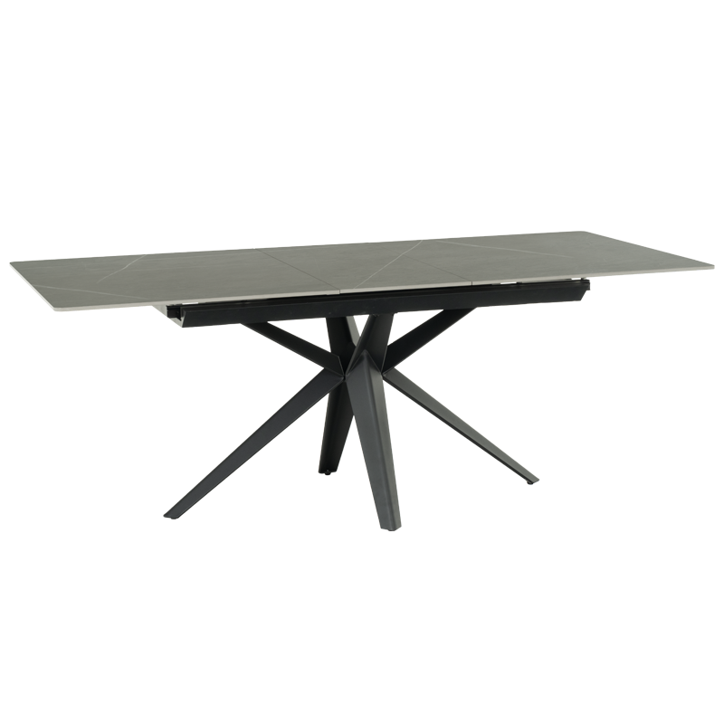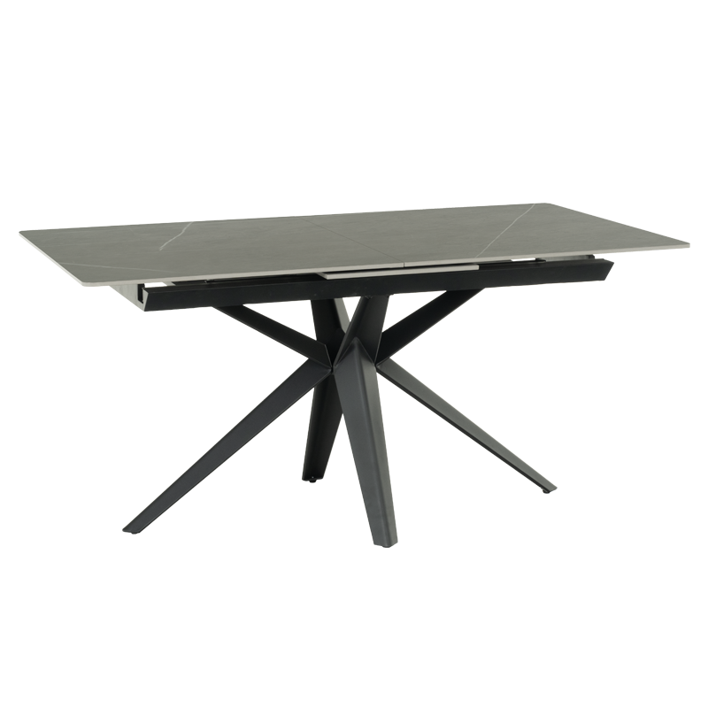 ZORY е трапезна маса с удобен разтегателен механизъм. Стилният ѝ дизайн я превръща в страхотен акцент за всеки дом. Керамичният плот е с дебелина 12 мм и със стандартен размер от 160 см, а при разтягане се удължава до 200 см. Така всеки гост или член на семейството ви ще се чувства комфортно. Разчупената метална основа осигурява стабилност и дълга експлоатация на масата. Пълна информация за размерите и характеристиките на модела ще намерите в таблицата в таб/поле "Техническа информация".