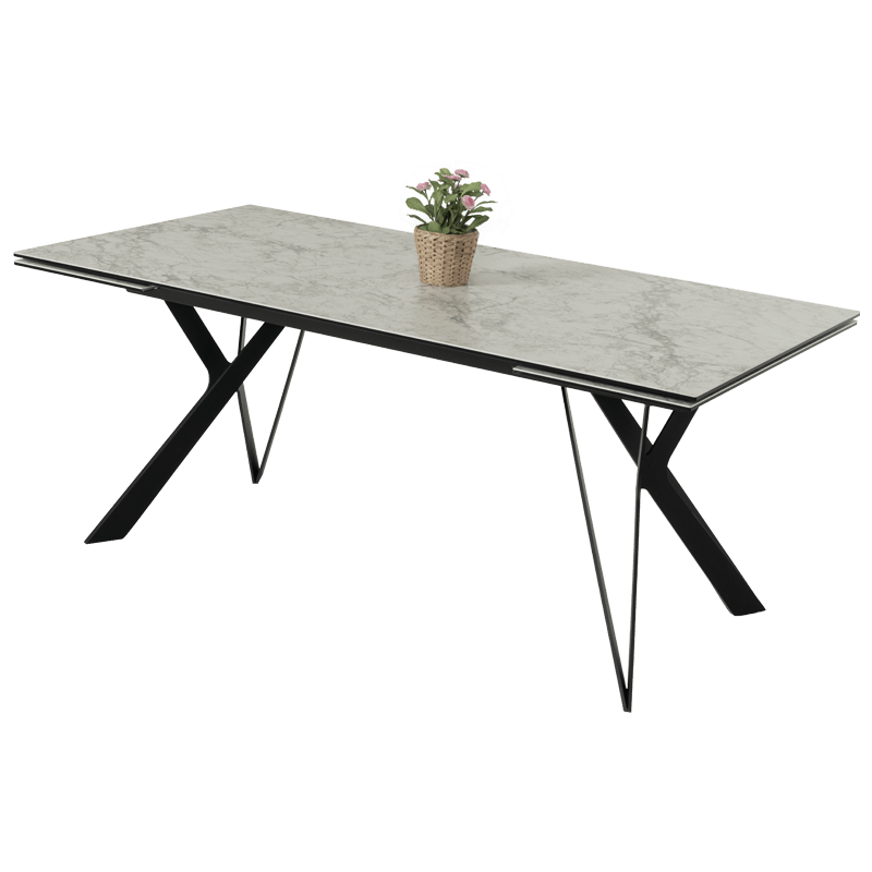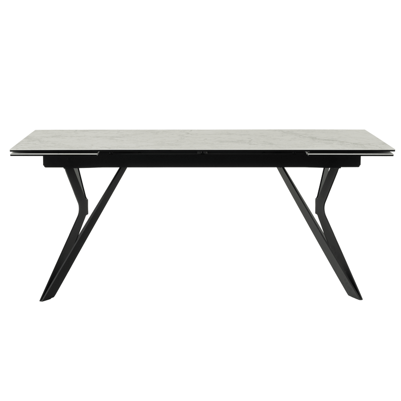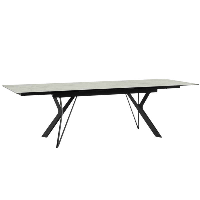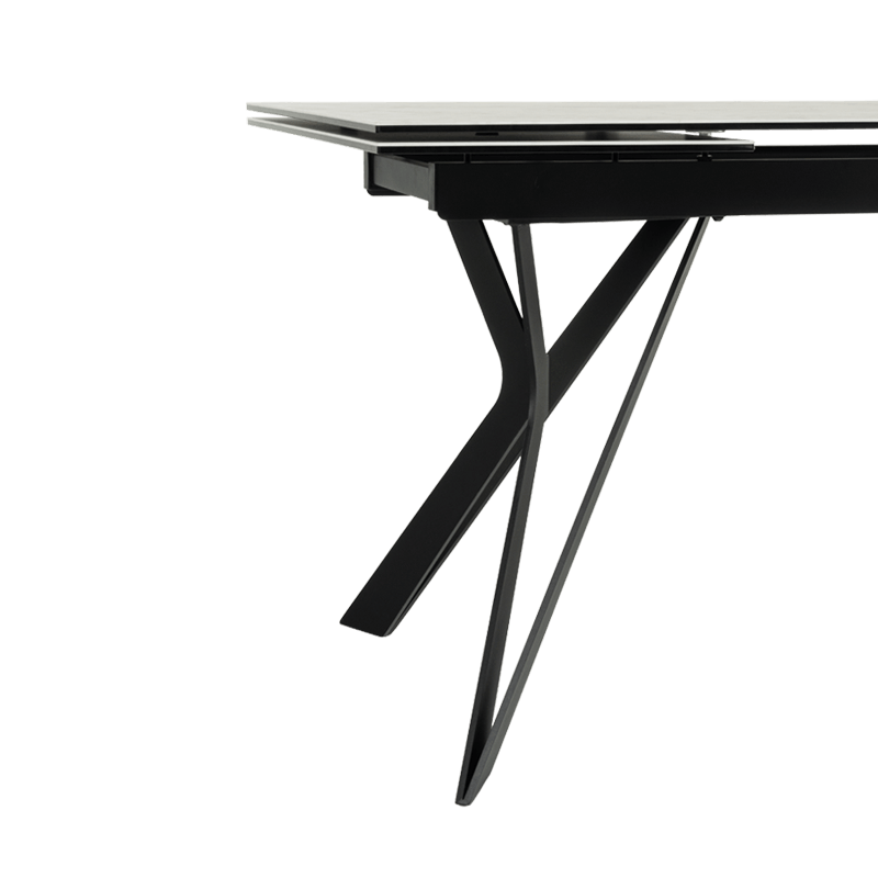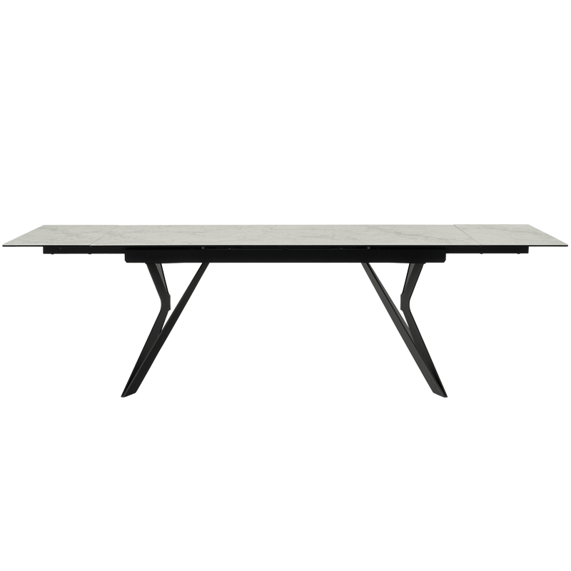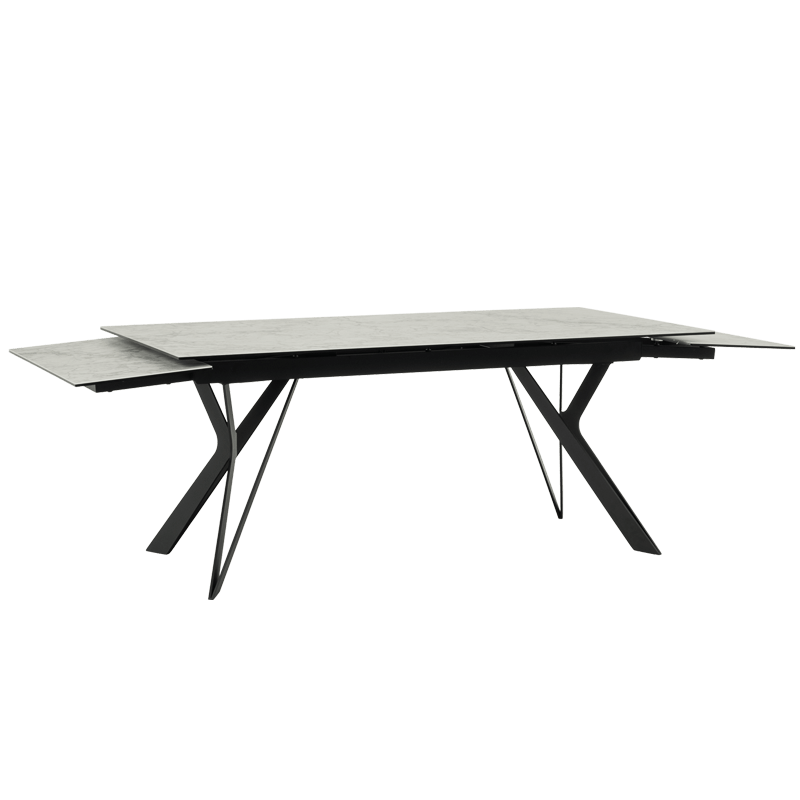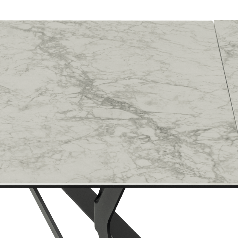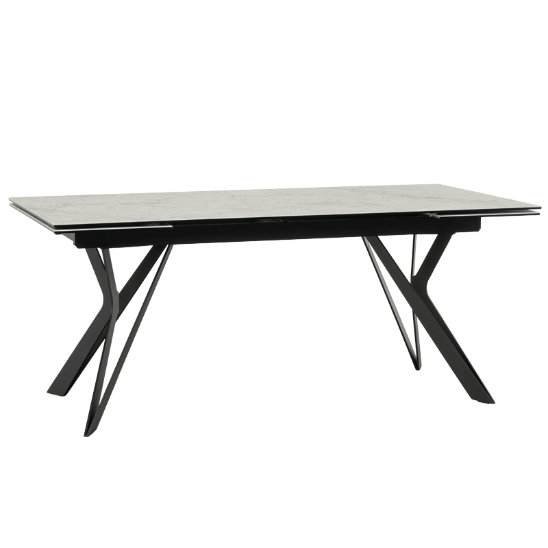 Трапезна маса MARKI впечатлява с елегантен и съвременен дизайн, съчетаващ издръжлив плот от керамика и закалено стъкло и стабилна основа от прахово боядисан метал. Масата разполага с функция за разтягане, увеличавайки дължината ѝ от 180 см до 260 см, осигурявайки допълнително пространство. С изчистени линии и устойчиви материали, моделът е идеален избор за всяка модерна трапезария. Всички детайли за размерите и характеристиките можете да намерите в раздел "Техническа информация".