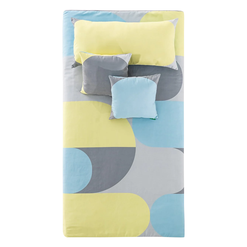 Детски спален комплект Minia е създаден да осигури комфорт и стил в детската стая. Със своя свеж и цветен дизайн, той внася уют и радост в спалното пространство на вашето дете. Комплектът включва правоъгълна възглавница с размери 80x40 см, две квадратни възглавници 40x40 см, калъфка за възглавница 70х50 см, шалте с размери 130x205 см и ластичен чаршаф с размери 152x252 см. Шалтето е изпълнено с 130 г/м² термо вата, която осигурява топлина и мекота, а използваните материали са антибактериални, антиалергични и антиканцерогенни, гарантирайки безопасност за здравето на вашето дете. Препоръчва се химическо чистене за възглавниците и шалтето, докато чаршафът може да се пере в пералня. Този комплект е идеален за легла с размери 80x180 см, предоставяйки пълен комфорт и здравословен сън. Пълна информация за размерите и характеристиките на модела ще намерите в таблицата в таб/поле "Техническа информация".