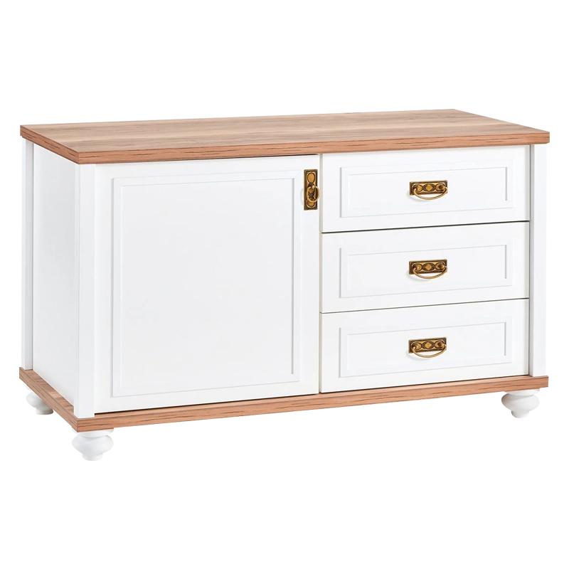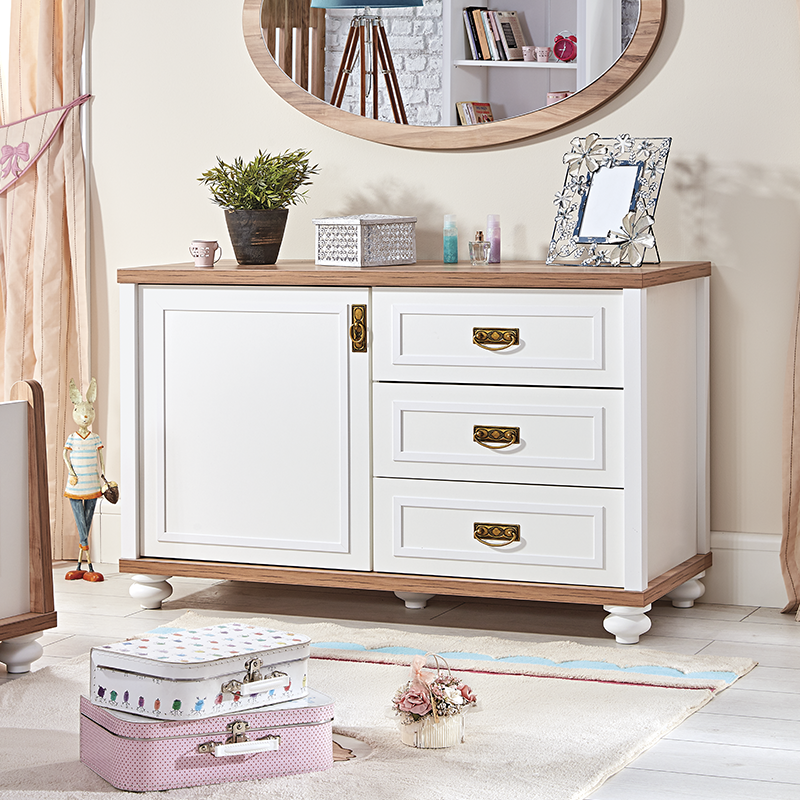 Детският скрин Tiffany впечатлява със стилен дизайн, функционалност и практичност с размери 115x71x49 см. Изработен от висококачествени материали, той разполага с безшумни чекмеджета и врата с амортисьорни механизми за безопасно използване. Месинговите дръжки добавят изискан завършек, а рафтовете и чекмеджетата издържат натоварване до 25 кг, осигурявайки стабилност и удобство във всяко детско пространство. Пълна информация за размерите и характеристиките на модела ще намерите в таблицата в таб/поле "Техническа информация".