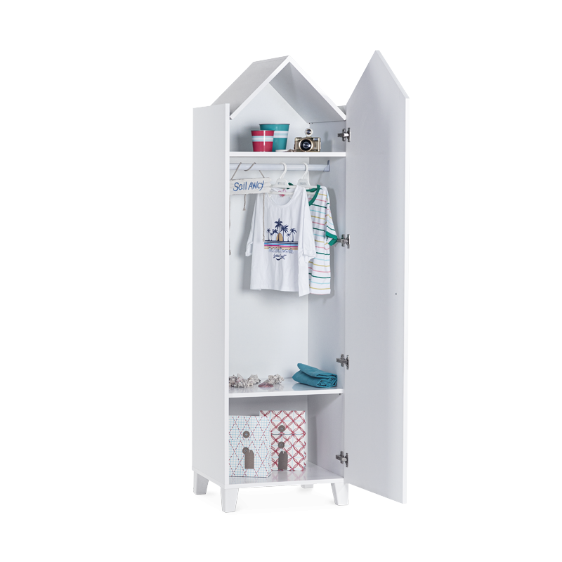 Еднокрилният гардероб MIAMI съчетава функционалност и модерен дизайн. Изработен от ПДЧ с дебелина 18 мм, моделът разполага с врата с панти с плавно затваряне за безшумна и безопасна употреба. Оборудван е с два просторни рафта и един лост за закачалки, които осигуряват удобство при организирането на дрехи и аксесоари. Допълнителното предимство е вграденото LED осветление със сензор за движение, което улеснява достъпа и добавя комфорт при ежедневна употреба. Благодарение на 10-сантиметровите ABS крачета, почистването с прахосмукачка робот е лесно и безпроблемно. Пълна информация за размерите и характеристиките на модела ще намерите в таблицата в таб/поле "Техническа информация".