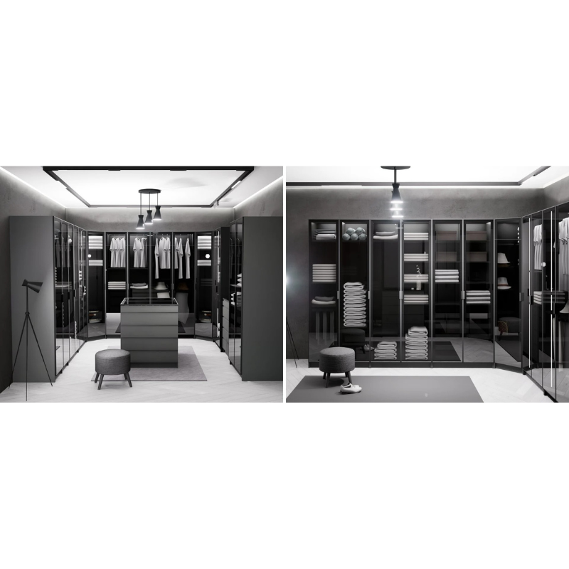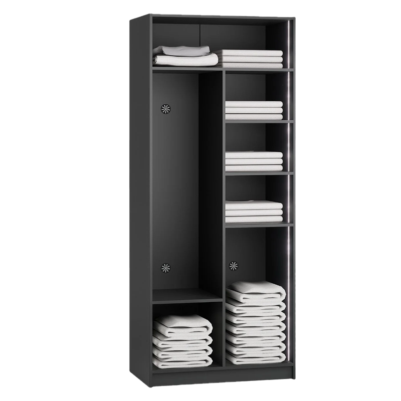 Съчетавайки стил и функционалност, двукрилният гардероб YORK е изработен от висококачествено ПДЧ с дебелина 18 мм. Разполага с пет рафта и един лост за закачалки, осигурявайки оптимално разпределение на пространството. Вграденото LED осветление с дистанционно управление предлага 10 режима, създавайки персонализирана атмосфера. Гардеробът се предлага без врати, които могат да бъдат закупени допълнително – две врати от опушено стъкло с огледален ефект, които придават модерен и елегантен завършек. За по-добра циркулация на въздуха, на гърба са разположени вентилационни отвори. Може да се използва самостоятелно или като модул към другите модели от серията YORK, създавайки перфектно организирано пространство. Пълна информация за размерите и характеристиките на модела ще намерите в таблицата в таб/поле "Техническа информация".